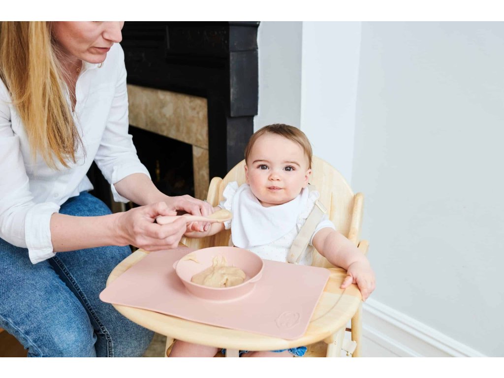 Povrch podložky je navrhnutý tak, aby absorboval kvapky a rozliate tekutiny. Protišmykový materiál misky zasa zaisťuje, že miska zostane na svojom mieste, takže Vás nezaskočí žiadna malá nehoda a môžete sa sústrediť na kŕmenie Vášho drobca.