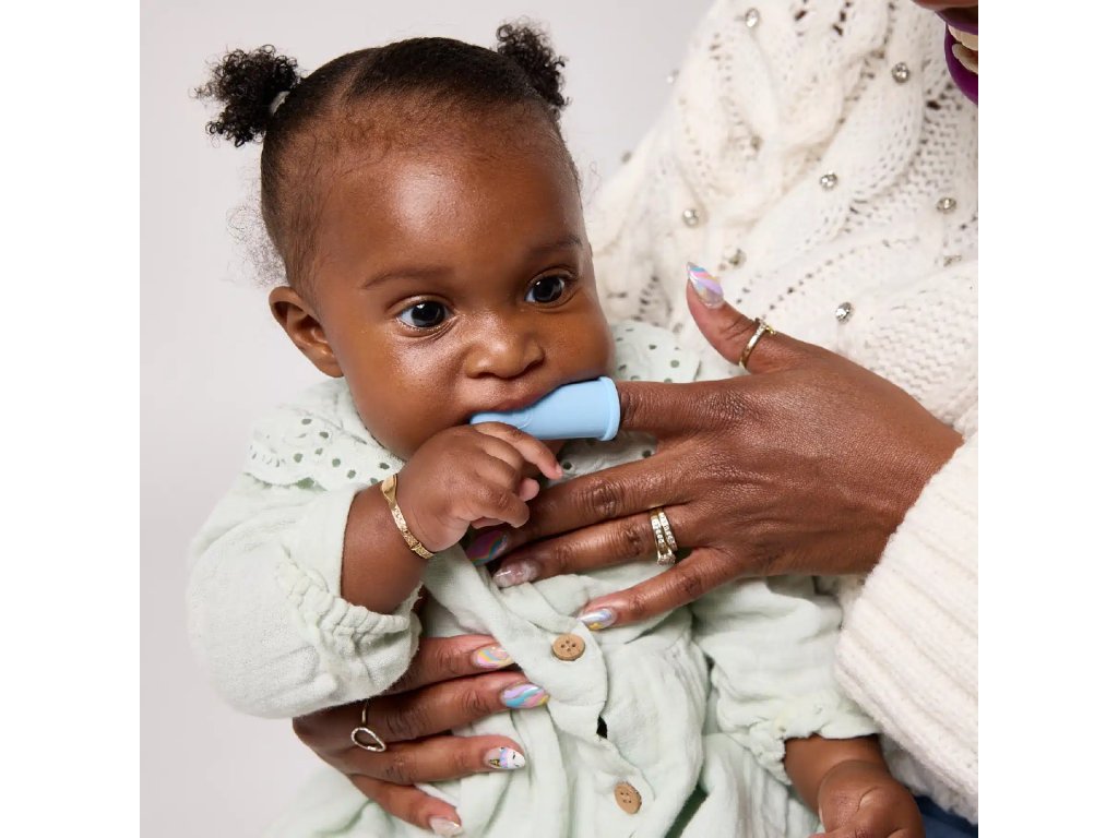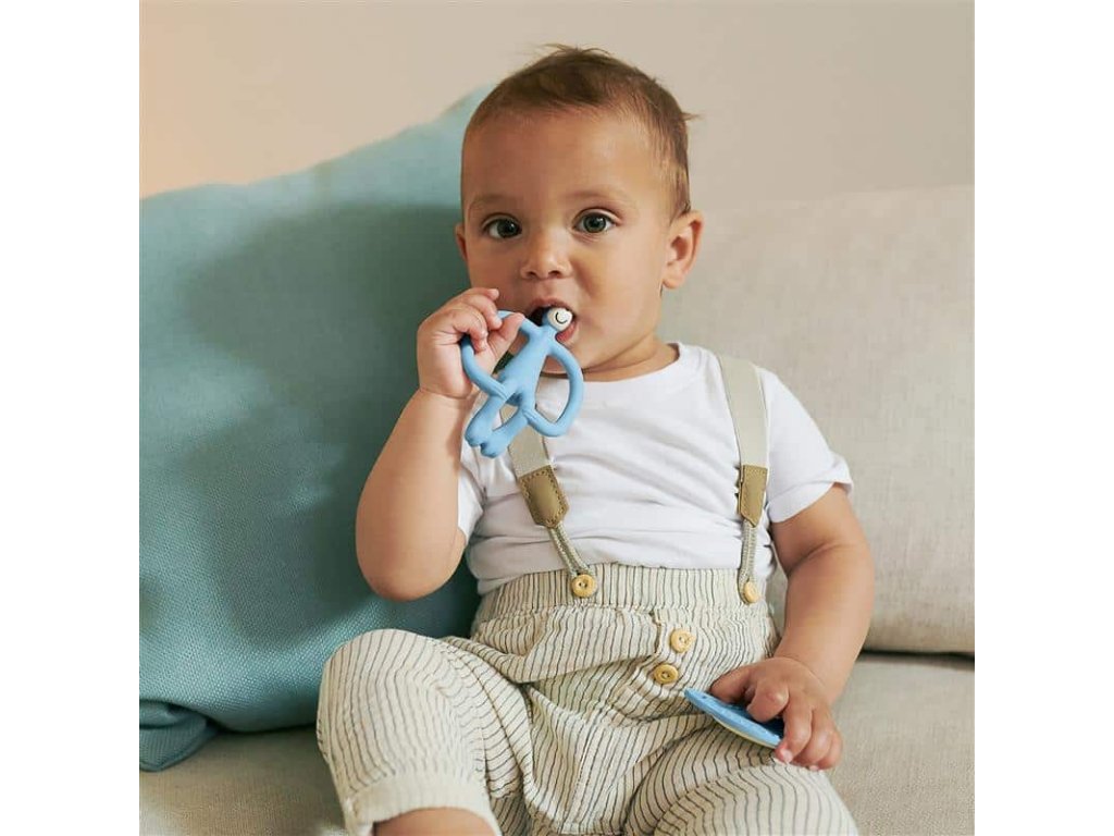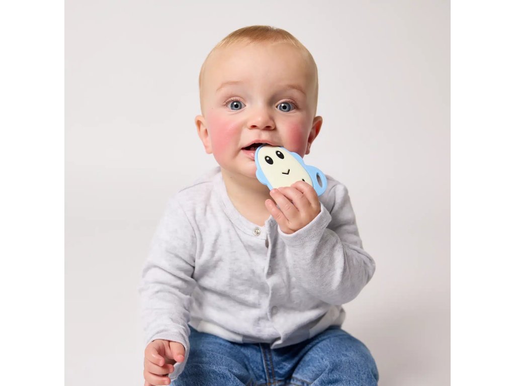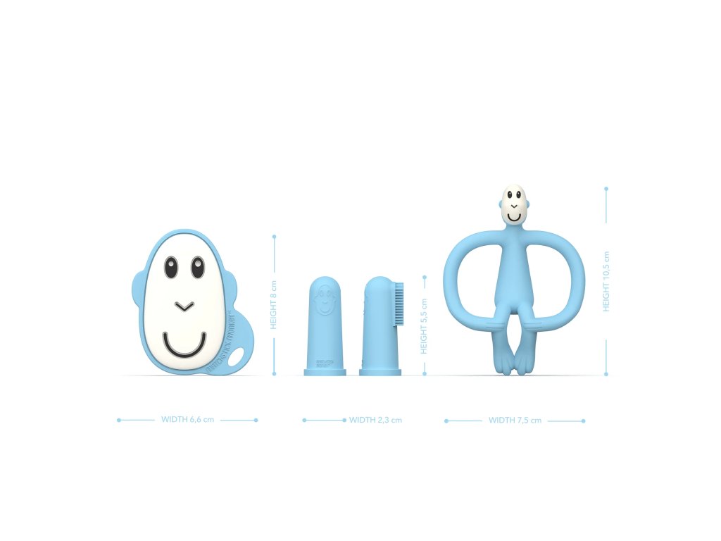 Modré hryzadlo v tvare opičky je zábavné, flexibilné a vďaka textúrovaným výstupkom rýchlo zasiahne miesto bolesti. Plochí opičí kamaráti sú malí, ľahučkí a ideálni do drobných detských ručičiek – skvelí na cesty alebo do tašky. Silikónové prstové kefky sú ideálnou prvou zubnou kefkou pre bábätko – jemné a šetrné k ďasnám.