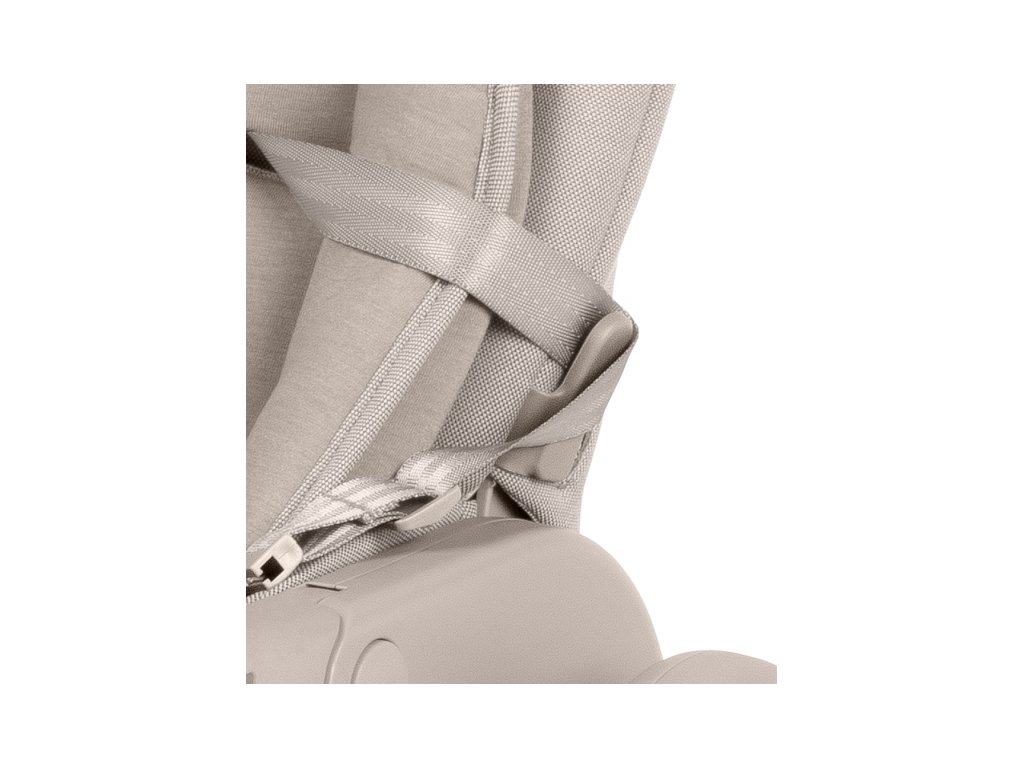 Podľa veku dieťaťa je dieťa v stoličke pripútané nastaviteľným 5-bodovým alebo 3-bodovým bezpečnostným pásom. Pri usadzovaní dieťaťa pásy neprekážajú vďaka úchytom, ktoré pásy držia otvorené.