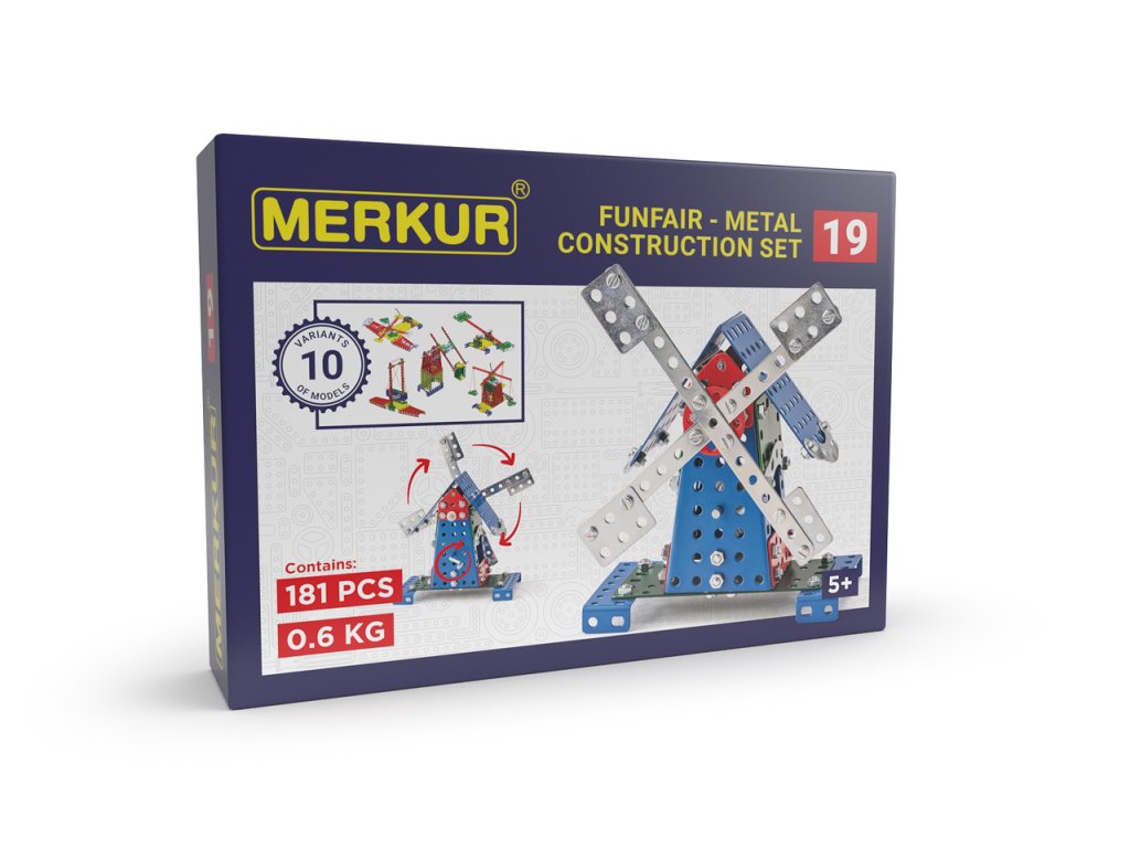 Zo stavebnice Merkur 019 Mlyn je možné podľa návodu zostaviť až 10 rôznych modelov púťových atrakcií. Malí konštruktéri môžu zostaviť aj model podľa svojich predstáv, fantázii sa medze nekladú. Stavebnica obsahuje 181 dielikov. Vhodné aj pre deti, ktoré s Merkurom začínajú. So zostavenými modelmi sa možno hrať, sú veľmi odolné. Rozmer balenia: 25,5 x 18 x 5 cm. Vek: 5+. Nevhodné pre deti mladšie ako 3 roky. Váha: 0,6 kg