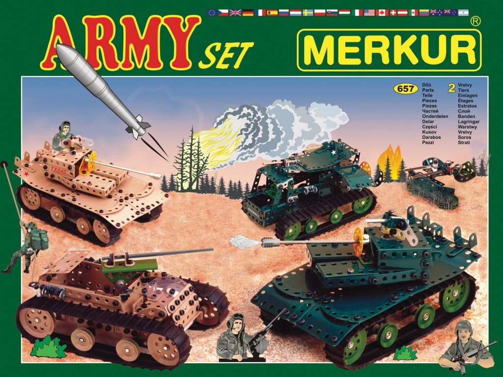 Chlapčenské sny o vojakoch, tankoch a vojenskej technike sa môžu stať skutočnosťou vďaka sete Merkur ARMY. Vrhnite sa s nadšením do stavby dvoch armád, ktorých prvky sa od seba budú líšiť farbou. Jedna armáda bude v pieskovej farbe, druhá v maskovacej zelenej. Hurá na stavanie, vydajte sa v ústrety nekonečnej vojne dvoch znepriatelených armád! Stavebnica obsahuje 657 dielikov a návod na 40 modelov. Vhodná pre deti, ktoré sa s Merkúrom ešte len zoznamujú. So zostavenými modelmi sa dá hrať, sú veľmi odolné. Nevhodné pre deti mladšie ako 3 roky. Rozmery balenia: 27 x 36 x 5 cm. Vek: 6+