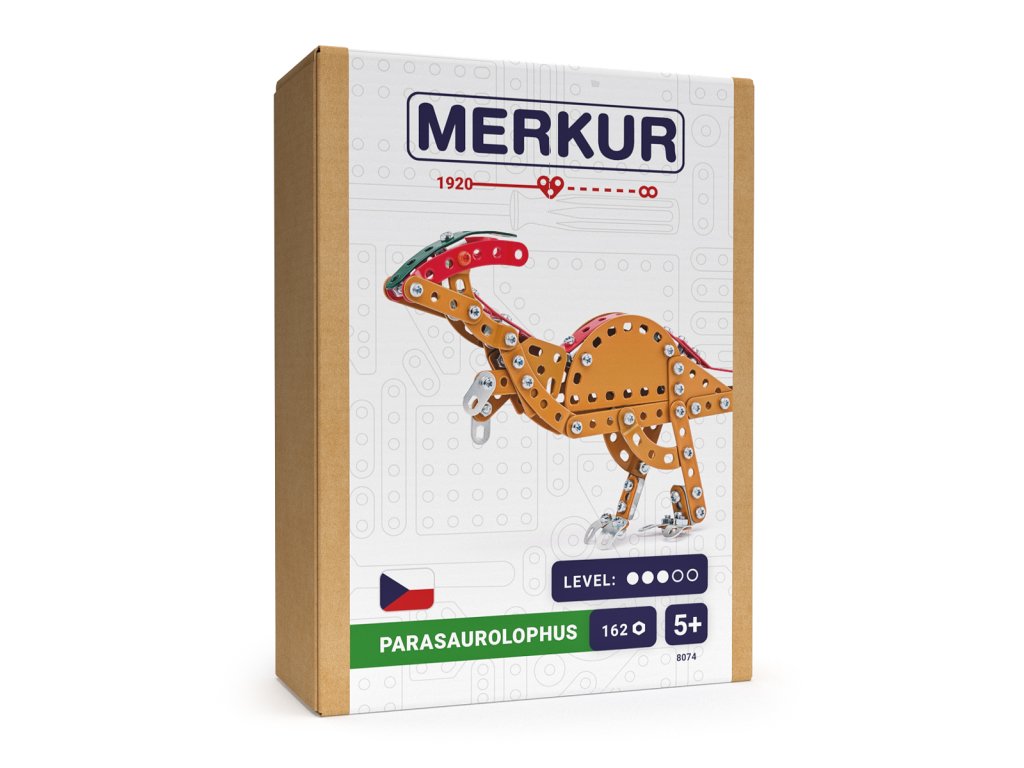 Kovový model dinosaura Parasaurolophus Merkur obsahuje súčiastky potrebné na stavbu dinosaura. V balení nájdete podrobný návod, Merkur sadu náradia a unikátne Merkur diely. Merkur diely sú univerzálne a tak vás neobmedzia v žiadnej modifikácii a nápade. Stavebnicu tak môžete zostaviť podľa priloženého návodu alebo čisto podľa svojich predstáv. So zostavenými modelmi sa dá hrať, sú veľmi odolné. Podporuje a rozvíja manuálne schopnosti, logické myslenie, sústredenie. Rozmery modelu: 20x19x10cm. Rozmer balenia: 18,5 x5,5x13,5 cm. Počet dielikov: 162. Nevhodné pre deti do troch rokov. Odporúčaný vek: 5+
