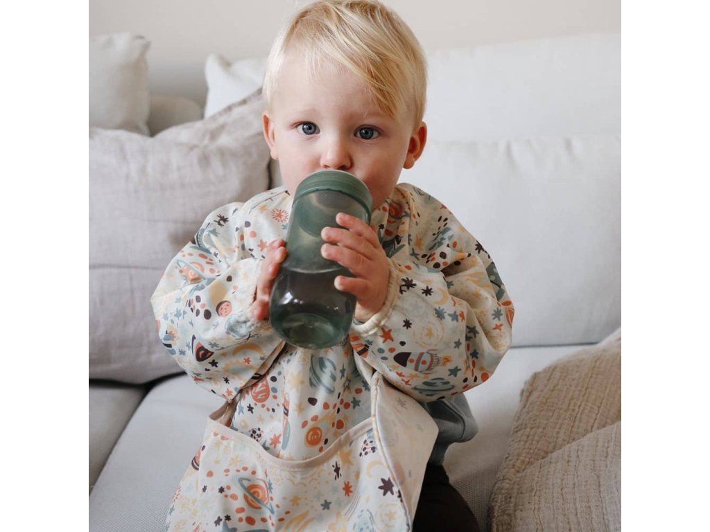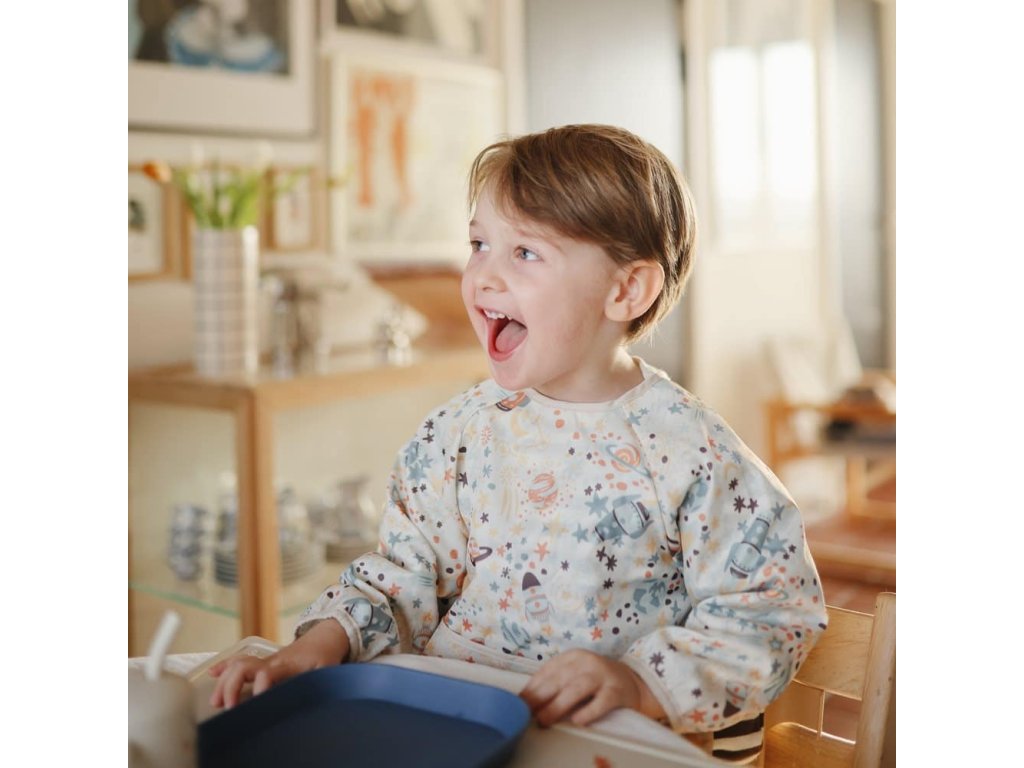 Podbradník s dlhým rukávom od značky Mushie pre bezproblémové jedenie!
