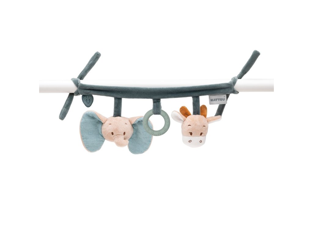 -obsahuje silikónovú hryzačku a dve hrkálky v tvare hlavy sloníka a žirafy