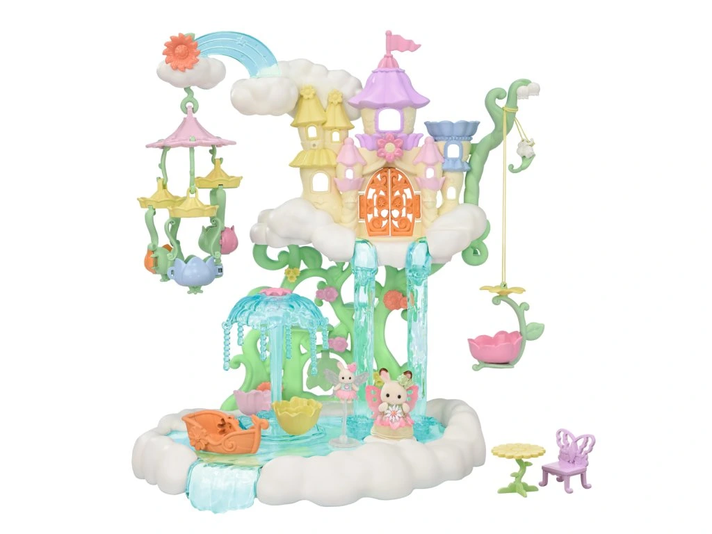 Vitajte v nebeskom paláci kvetinových víl. Tento krásny set plný atrakcií prenesie milovníkov sveta Sylvanian Families do magického sveta úžasnej zábavy. Nebeský palác je obklopený snehovo bielymi mrakmi, z ktorých vychádzajú krištáľovo čisté vodopády. Modré pramienky tryskajú bublinkami vody, vytvárajúce fontánu-kolotoč s dvoma sedadlami v tvare kvetinových kalichov. Voda z prameňa a vodopádov padá priamo do jazierka, na ktorom pláva loďka s kúzelným držiakom na kvetinovú vílu. Kvetinová víla pripevnená k držiaku vyzerá, akoby skutočne levitovala vo vzduchu. Malý ostrovček z mraku je ideálnym miestom na obdivovanie jazierka. Kvetinový výťah zavezie deti na vyhliadkovú terasu, odkiaľ majú výhľad na celé okolie. Nebeský kolotoč s tromi sedadlami v tvare kvetinových kalichov je pripevnený k mrakom, ktoré sa vznášajú nad palácom. V nebeskom paláci kvetinových víl je množstvo vzrušujúcich atrakcií, ktoré si zamilujú všetky baby zvieratká. Deti, ktoré budú chcieť odpočívať, si môžu sadnúť k malému stolíku v útulnej kaviarni. Sada obsahuje dve roztomilé figúrky malú Creme z rodiny čokoládových králikov a figúrku malého zajačika-kvetinovej víly. Sadu je možné kombinovať s ďalšími setmi z kolekcie Kvetinovej víly. Hračky Sylvanian Families rozvíjajú predstavivosť a povzbudzujú deti k hraniu rolí. Hra s figúrkami rozvíja kreativitu a učí emóciám vytváraním a rozprávaním príbehov založených na každodenných zážitkoch a pozorovaní sveta. Vyznačujú sa najvyššou kvalitou a výnimočným dôrazom na detaily. Figúrky Sylvanian Families sú pokryté mäkkým semišom, majú pohyblivé končatiny a hlavu. Oblečenie je možné z figúrok zložiť a vymeniť za iný outfit. Balené v krabičke. Rozmery balenia: 35 x 44 x 14 cm. Vek: 3+