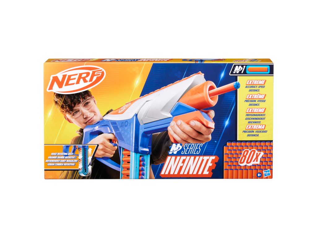 Pištoľ Nerf N Series Infinite od Hasbro, s ktorou len tak nejaká hra neomrzí. Blaster s vysokou kapacitou. Inovatívny dizajn bojového pásu pre ľahké a rýchle nabíjanie - pás pojme 40 šípok. Možnosť rýchleho výstrelu niekoľkých šípok za sebou alebo pomocou mechanizmu pump action. Obsahuje 80 šípok. Hra s Nerf podporuje spoluprácu, rýchle rozhodovanie a presnú mušku. Hra s pištoľou zaistí neopakovateľnú atmosféru a poriadnu dávku zábavy. Vyrobené z kvalitného plastu. Pri hraní sa odporúča, aby deti použili bezpečnostné okuliare (nie sú súčasťou). Rozmer balenia:34,29 x 66,04 x 8,09 cm. Vhodné od 8 rokov.