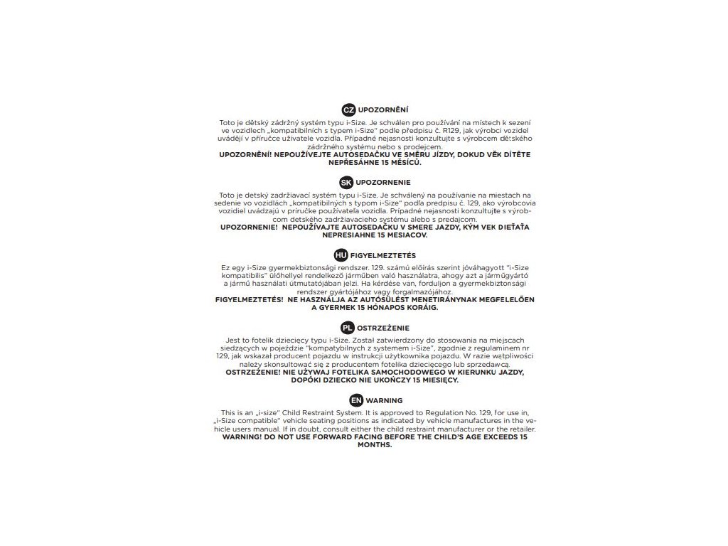 Toto je detský zádržný systém typu i-Size. Je schválený na používanie na miestach na sedenie vo vozidlách kompatibilných s typom i-Size, podľa predpisu č. 129, ako výrobcovia vozidiel uvádzajú v príručke používateľa vozidla. Prípadne nejasnosti konzultujte s výrobcom detského zadržiavaceho systému alebo s predajcom.