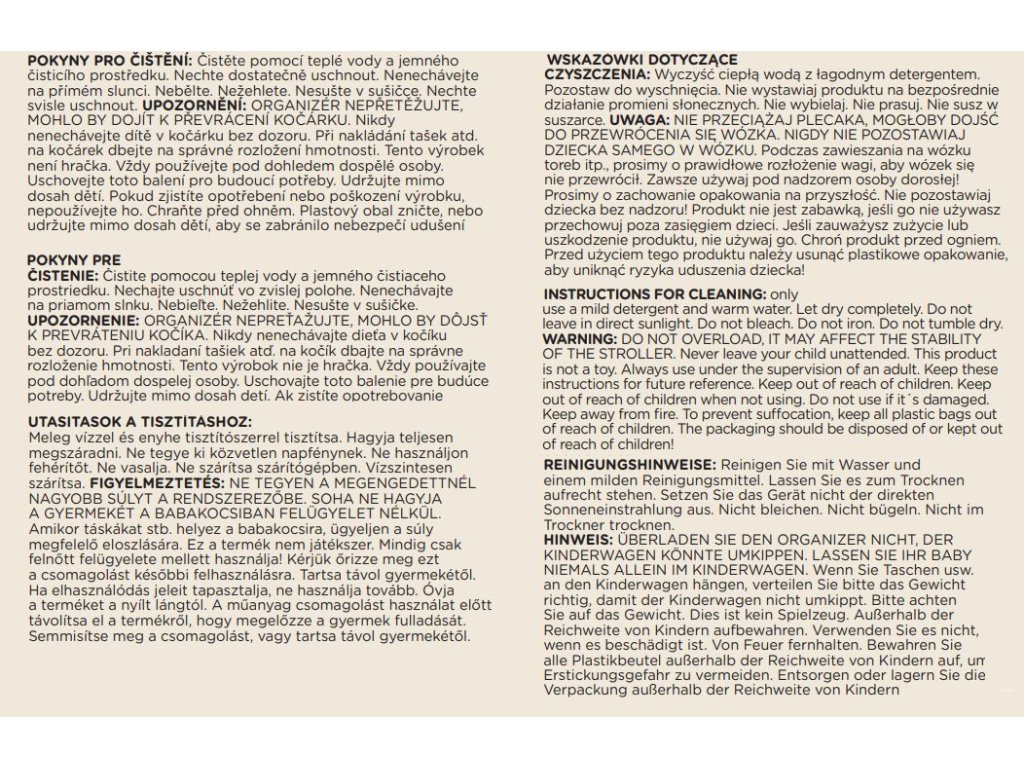 Prebaľovaciu tašku nepreťažujte, mohli by dôjsť k prevráteniu kočíka! Nikdy nenechávajte dieťa v kočíku bez dozoru. Pri nakladaní tašiek na kočík dbajte na správne rozloženie hmotnosti. Tento výrobok nie je hračka. Vždy používajte pod dohľadom dospelej osoby. Uschovajte balenie pre budúci potreby. Udržujte mimo dosah detí. Ak zistíte opotrebovanie alebo poškodenie výrobku, nepoužívajte ho. Chráňte pred ohňom. Plastový obal zničte, alebo udržujte mimo dosah detí, pretože môže dôjsť k uduseniu.