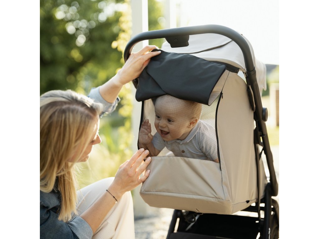 - Rozšíriteľná strieška s čiernym zipsom a integrovaným šiltom s UPF50+