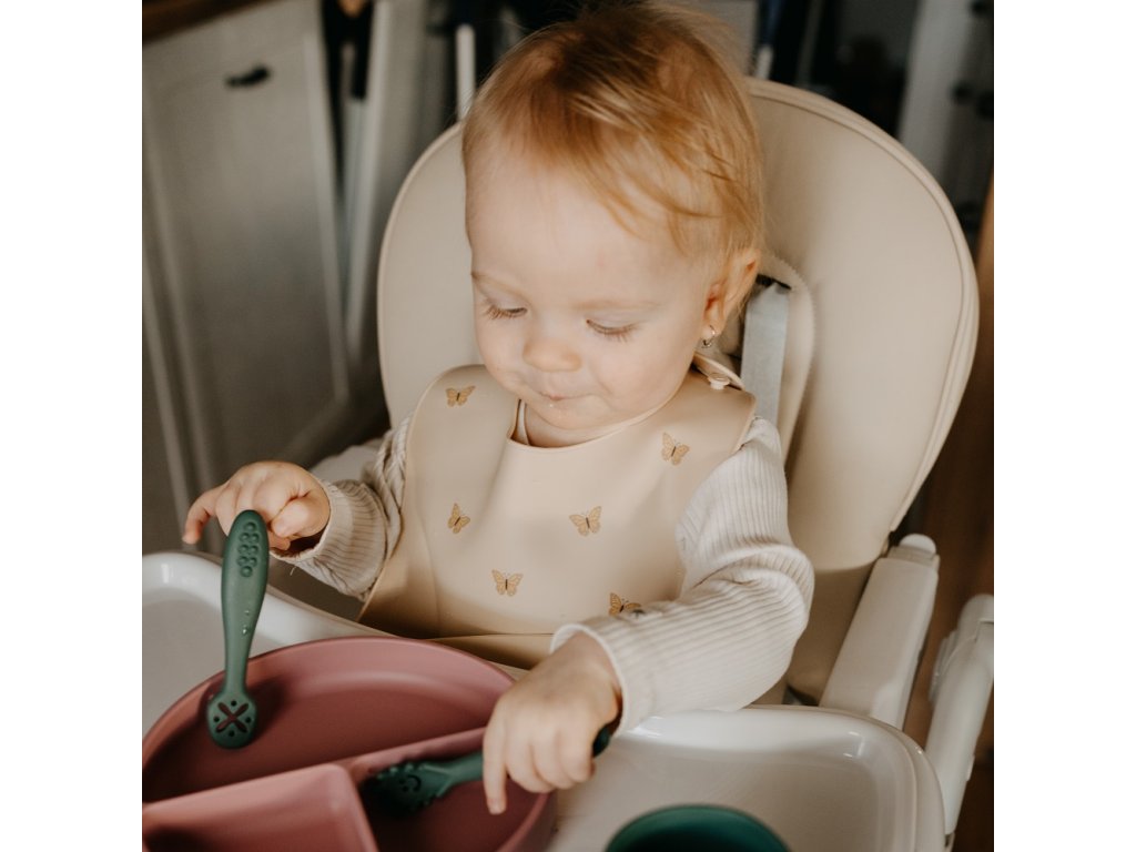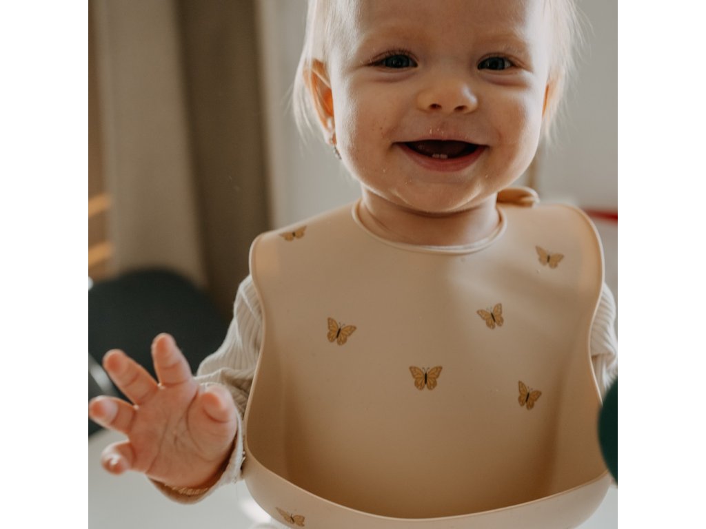 Podbradník je vyrobený z potravinárskeho silikónu bez obsahu BPA. Je určený pre malé deti od 6 mesiacov, ktorým sa zavádzajú prvé príkrmy, a pre tie, ktoré sa už úspešne učia samostatne jesť. Má nastaviteľné zapínanie, ktoré umožňuje prispôsobiť ho veľkosti krku dieťaťa. To znamená, že podbradník rastie spolu s dieťatkom. Vďaka ergonomickému tvaru a mäkkému materiálu sa podbradník pohodlne nosí a neobmedzuje pohyb dieťaťa pri jedení. Dá sa tiež zrolovať, a preto nezaberá veľa miesta v taške, keď idete na prechádzku alebo na výlet.