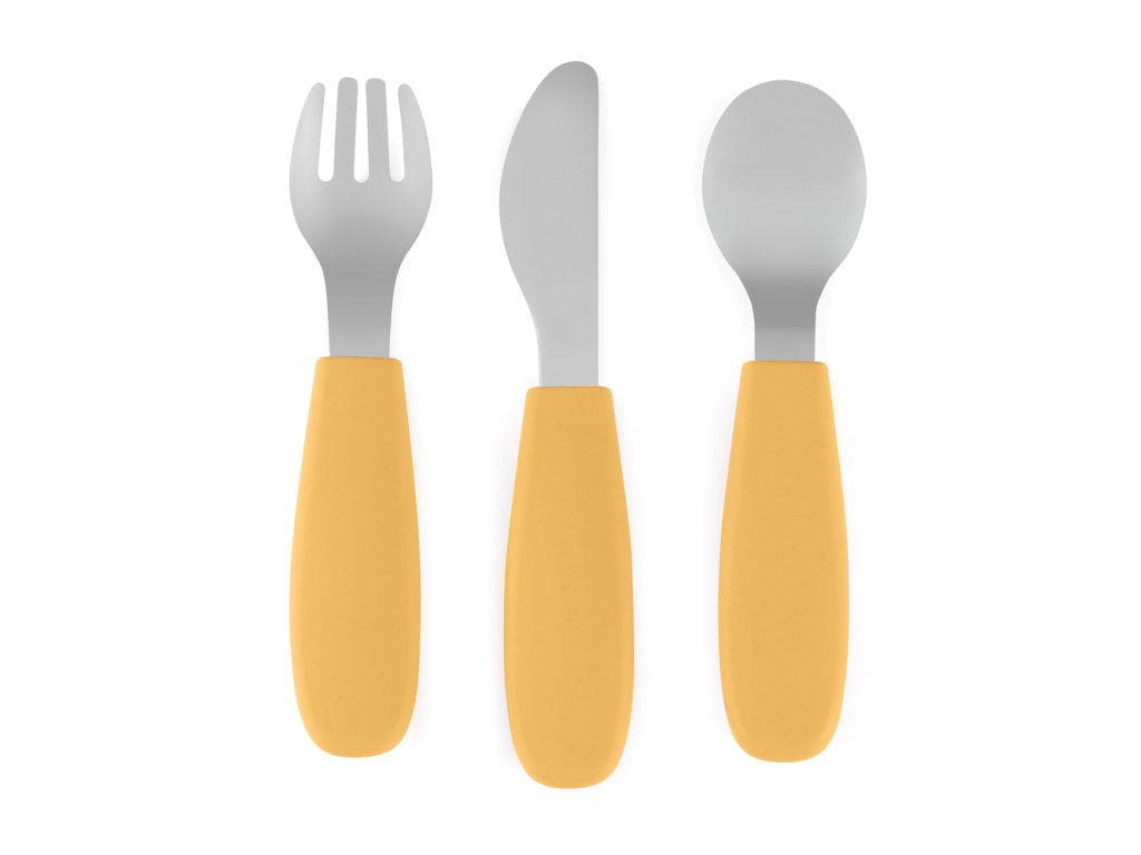 Funkčné časti sú vyrobené z kvalitnej nehrdzavejúcej ocele, rukoväte sú ergonomické a potiahnuté mäkkým silikónom vhodným na kontakt s potravinami – ideálne prispôsobené detským rúčkam. To zaručuje pohodlný a istý úchop a podporuje správne stravovacie návyky.