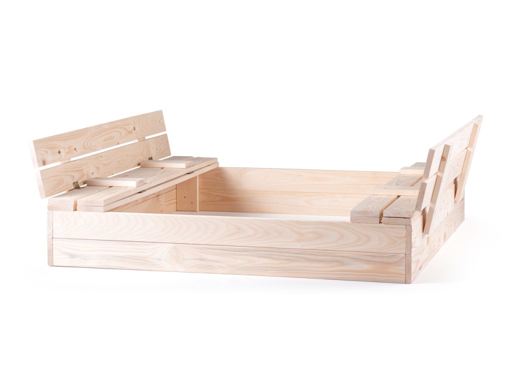 Pieskovisko z masívneho dreva je vybavené vekom, ktoré chráni piesok pred zvieratami, opadaným lístím a inými nečistotami v čase, keď sa v ňom deti nehrajú. Pokiaľ sa deti na pieskovisku zrovna hrajú, je veko otvorené a premení sa v lavičky, ktoré umožnia pohodlné sedenie pri hre. | Rozmer: 120 x 113 x 19 cm | Vek: 3+