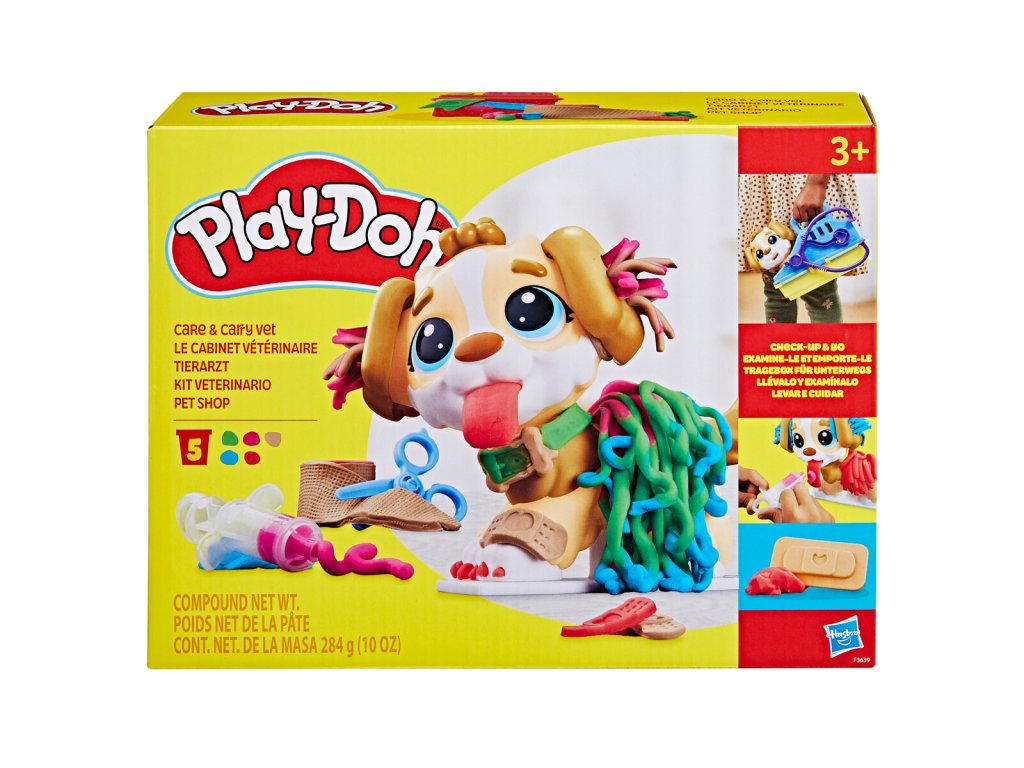 Na toto šteniatko by sa mal niekto pozrieť! Žiadny strach, o rozkošného psíka sa radi postarajú malinkí veterinári. Fantázii sa medze nekladú. Môže vyplazovať jazyk a má niekoľko šmrncovných štýlov! Šteniatko si navyše môže vliezť do roztomilej prepravky, kam sa dajú umiestniť všetky doplnky. Každý správny veterinár musí mať samozrejme po ruke príslušenstvo, ako sú nožnice na starostlivosť o srsť, stetoskop a ďalšie. Tento nádherný darček je jednoducho zárukou skvelej zábavy! So sadou kvalitnej modelíny Play-Doh Veterinár od Hasbro si vaše deti užijú veľa zábavy. Hra podporí ich tvorivosť a fantáziu, pričom sa zároveň šetrne rozvinie ich jemná motorika. Špeciálna Play-Doh modelína je ľahko tvarovateľná a veľmi mäkká, zároveň nefarbí, nešpiní ani nevysychá. Play-Doh modelína Veterinár s roztomilým psíkom, prepravkou a sadou nástrojov. Play-Doh set je perfektný aj ako darček. Vek: 3+