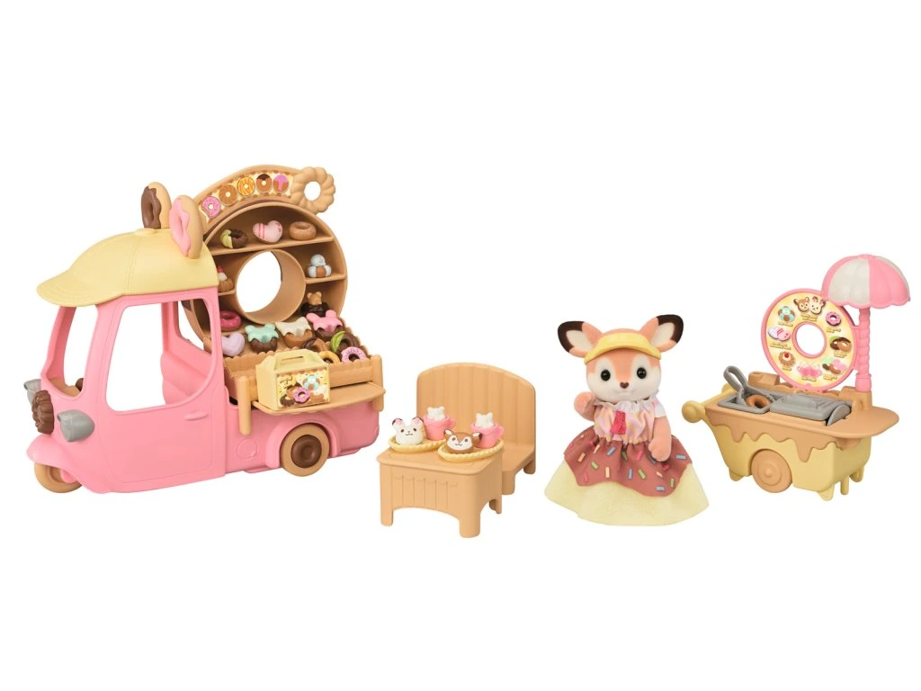 Pozývame vás na lahodné donuty. Šikovný vozík s veľkým okrúhlym donutom na streche sa objavil v Sylvanian Families. Keď mama z rodiny Jeleňou Primrose, prichádza so svojim šiškovým vozíkom, všetci milovníci sladkého pečiva sa postavia do dlhého radu. Stačí pár krokov a vozík sa zmení na malý obchodík so šiškami. Všetky donuty sú pripravované na mieste a zdobené podľa objednávky každého hosťa. Sada obsahuje množstvo šišiek rôznych tvarov a viac ako 30 doplnkov. Jelenia mama Primrose je oblečená v roztomilom kostýme pripomínajúcom sladkú šišku s farebným posypom. Stánok s donutmi je možné premeniť na malý autobus pre deti z ríše Sylvanian Families. Sada obsahuje aj vozík s priestorom na vyprážanie a zdobenie šiškových dobrôt. Hračky Sylvanian Families rozvíjajú predstavivosť a povzbudzujú deti k hraniu rolí. Hra s figúrkami rozvíja kreativitu a učí emóciám vytváraním a rozprávaním príbehov založených na každodenných zážitkoch a pozorovaní sveta. Vyznačujú sa najvyššou kvalitou a výnimočným dôrazom na detaily. Figúrky Sylvanian Families sú pokryté mäkkým semišom a majú pohyblivé končatiny a hlavu. Balené v krabičke. Rozmery balenia: 23 x 28 x 9 cm. Vek: 3+