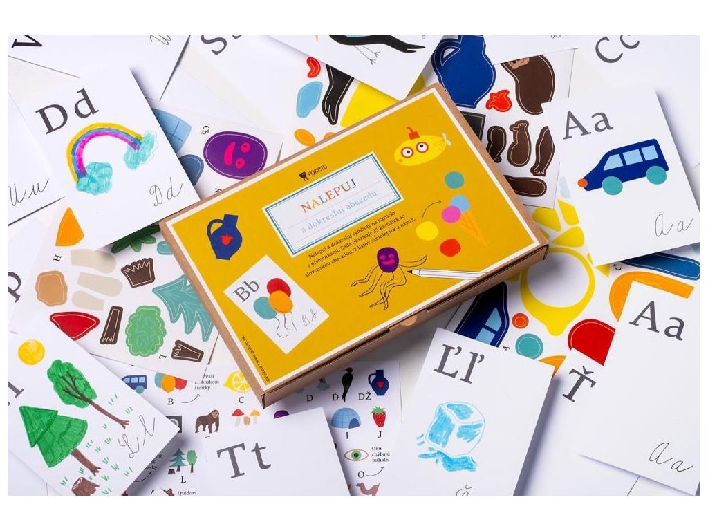 „Nalepuj a dokresľuj abecedu“- v krabičke dieťa objaví sadu kariet s písmenkami abecedy a sedem listov samolepiek na dotvorenie odpovedajúcich symbolov.