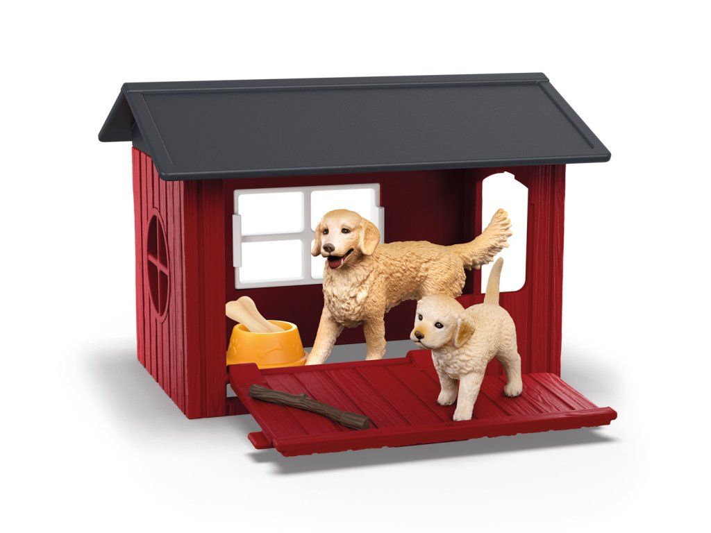 Fenka zlatého retrievera vybehne spoza peknej psej búdy a zvedavo sa rozhliada. Kto príde na návštevu? Starostlivo sleduje, kto je na farme. To isté naučila aj svoje roztomilé šteniatko. Ale možno chcú zlatí retrievery len presvedčiť hostí, aby sa s nimi pohrali. Je tu palica, ktorá čaká, kým ju hodíte. Kto sa chce hrať? Každý, kto navštívi farmu, musí prejsť okolo psej búdy, kde žijú zlatí retrieveri. Je tam mama zlatého retrievera so šteniatkom. Búda je natretá na červeno a má sivú strechu. Bočné okná prepúšťajú dostatok svetla. Bočný panel sa dá otvoriť. Strecha je odnímateľná. Búda je kompatibilná so všetkými psami z radu Schleich® Každý pes sa bude vo svojej novej búde cítiť ako doma. Okrem toho možno červenú búdu pre psa dokonale integrovať do existujúcej kolekcie Farm World. Obsah: 1× búda pre psa s bočnou klapkou a dvoma oknami, 1× mama zlatého retrívera, 1× šteňa zlatého retrívera, 1× miska, 1× kosť, 1× palica. Tento výrobok Schleich® patrí do tematického sveta FARM WORLD a je vhodný pre deti od 3 rokov. Rozmery búdy: 7,8 × 13 × 17 cm.