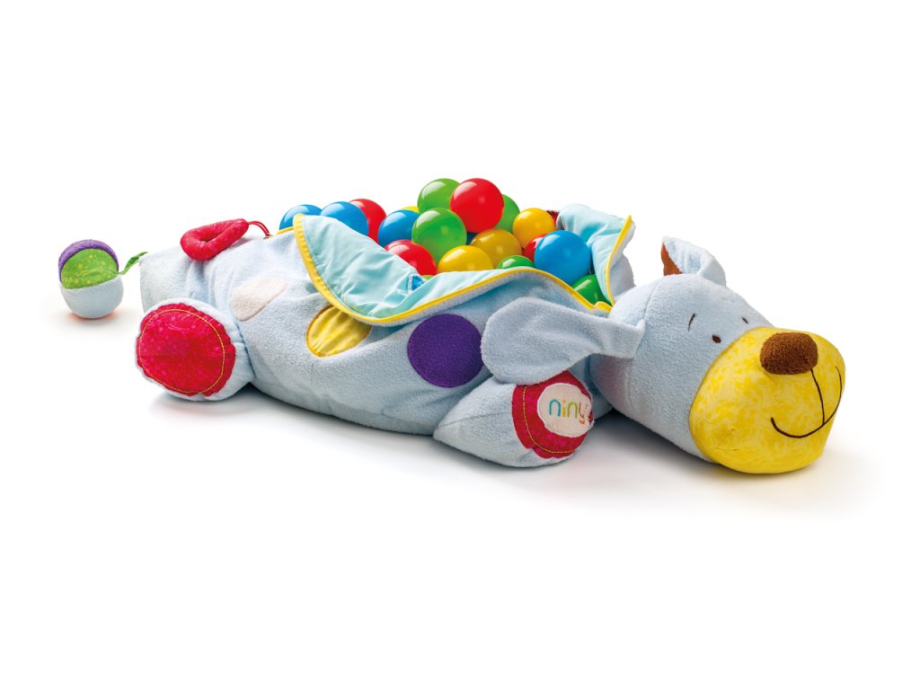 Veľký plyšový Kamarát psík ´´IPO´´ so 60-timi loptičkami je upokojujúca hračka z kolekcie Niny. V jeho tele je uložených 60 farebných plastových loptičiek. Chvostík je vyrobený z látkovej loptičky, ktorá vydáva zvonivý zvuk. Na tele psíka sú hracie prvky, prestrkávacie okienka, zrkadielko. Ušká šuštia. Všetky použité materiály sú príjemné na dotyk a ponúkajú deťom ničím nerušený čas relaxácie. Design nemeckej návrhárky Britta Hurter. Rozmer: 124 cm (šírka). Vek: 6m +. Video: https://www.youtube.com/watch?v=Jt_lGXfD7Bo