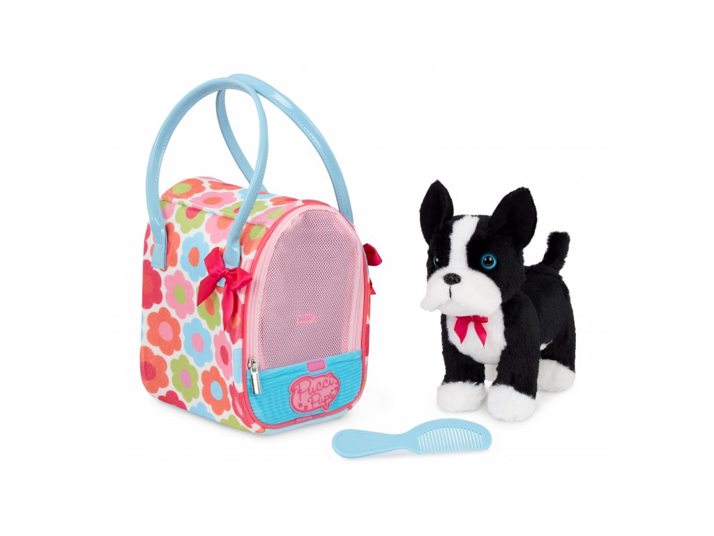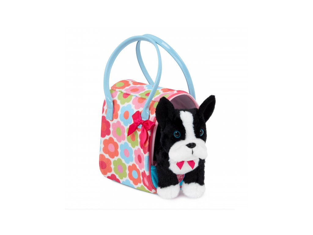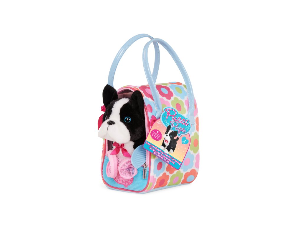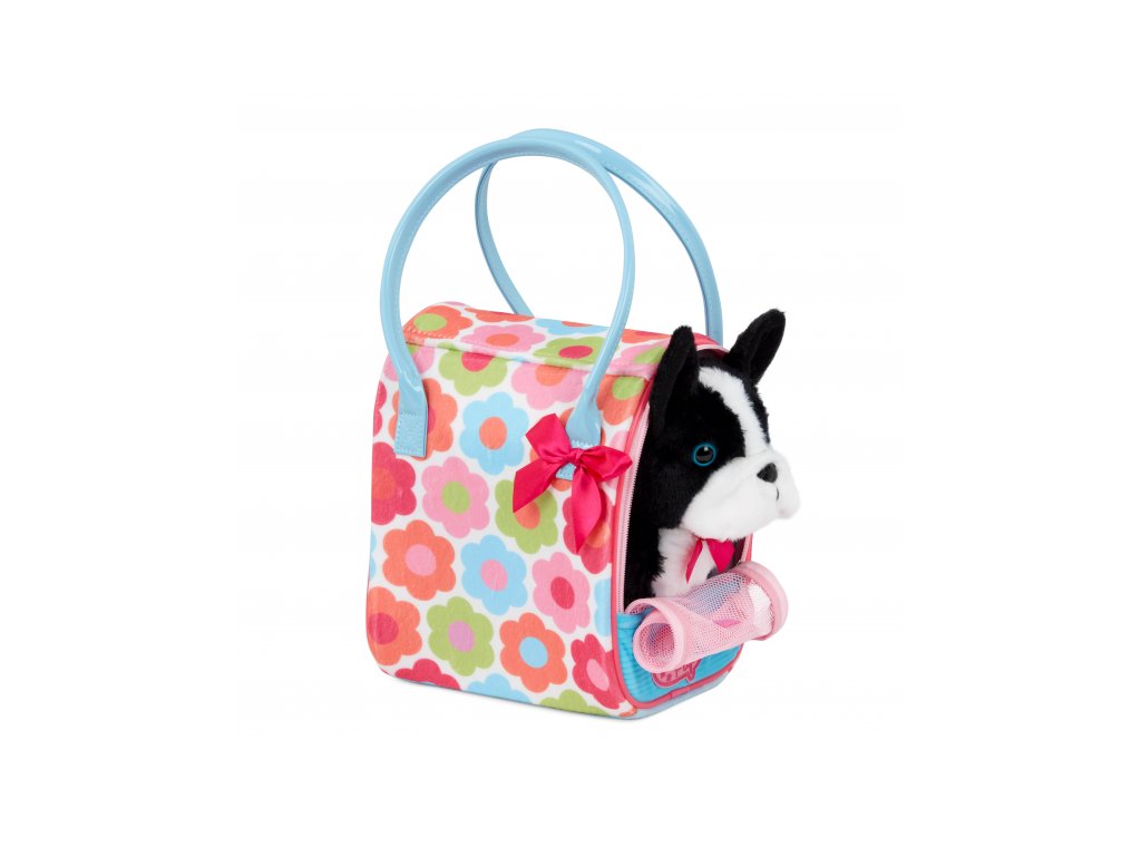 Rozkošné plyšové šteňa v taške s farebnou kvetinovou potlačou je vždy pripravené na maznanie aj na prechádzku. Miluje vyčesávanie svojej hebkej srsti hrebienkom a vďaka taške si ho vaše dieťa môže vziať kamkoľvek. Taška má priehľadnú prednú stenu zo sieťoviny s otváraním na zips, aby šteniatko pri prenášaní videlo na svet.