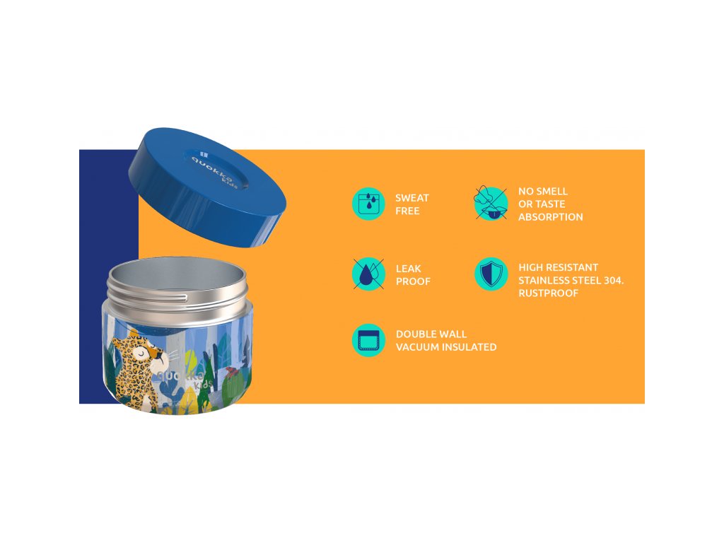 Termoska na jedlo Quokka Whim Kids z vysoko kvalitnej dvojstennej ocele so spoľahlivým, 100% tesniacim uzáverom udrží vaše jedlo podľa potreby teplej alebo studenej až 4 hodiny. Termoska je vhodná na bezpečné prenášanie desiaty či obeda do školy aj na výlety.