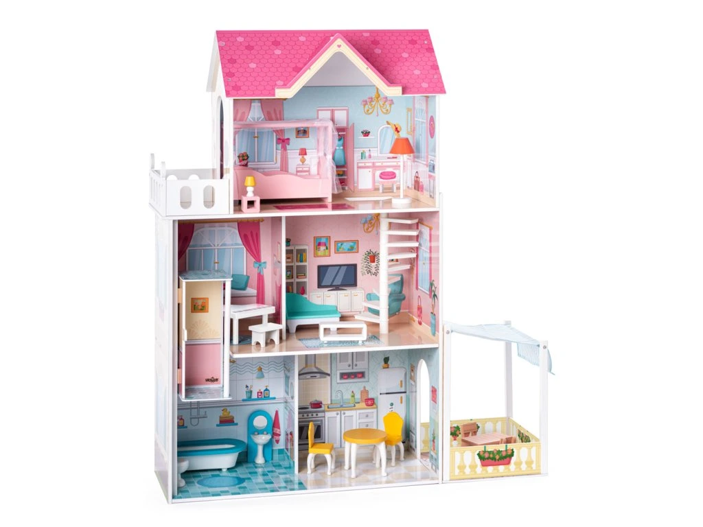 Kvalitný trojposchodový domček pre bábiky typu Barbie (30 cm) dodávame vrátane zobrazeného príslušenstva (18ks). Nábytok je vyrobený z kombinácie materiálov drevo/plast/textil. Z prízemia na prvé poschodie sa môžu bábiky zviezť výťahom. Bábiky nie sú súčasťou výrobku. K príslušenstvu domčeku patrí rovnako pergola so záhradným nábytkom a markízou. | Vek: 3+ | Rozmery: 75 x 39 x 120 cm | Pergola: 30 x30 x 42 cm