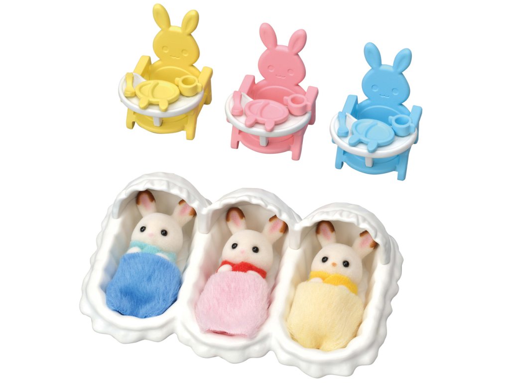 Sada malých roztomilých Chocolate zajačikov. Trojičky Flora, Fauna a Philip Chocolate sú najnovšími prírastkami v rodine Chocolate králikov. Bábätká môžete položiť do kolísky a prikryť dekou alebo posadiť do detských jedálenských stoličiek a nakŕmiť ich. Trojičky majú milujúcich rodičov, starých rodičov, bratov a sestry, ktorí sa o ne starajú a hrajú s nimi (figúrky nie sú súčasťou balenia). Figúrky sú vyrobené z plastu, ktorý je potiahnutý jemnučkým zamatom. Očká sú z čiernych korálikov. Všetky končatiny sú pohyblivé a hlavička otáčacia. Oblečenie je vyrobené tak, aby sa dalo opakovane vyzliekať a obliekať. Užite si viac zábavy s ďalšími figúrkami a doplnkami Sylvanian Families (predávajú sa samostatne). Herné sady a figúrky Sylvanian Families sú nadčasové a vysoko kvalitné hračky. Hra podnecuje predstavivosť dieťaťa. Sada obsahuje: 3x figúrka bábätiek, 3x oblečenie, 3x jedálenská stolička, 3x tanier, 3x hrnček, 3x lyžička, 3x deka, 3x kolíska. Vek: 3+. Video: https://www.youtube.com/watch?v=_2L_IHM_tPE