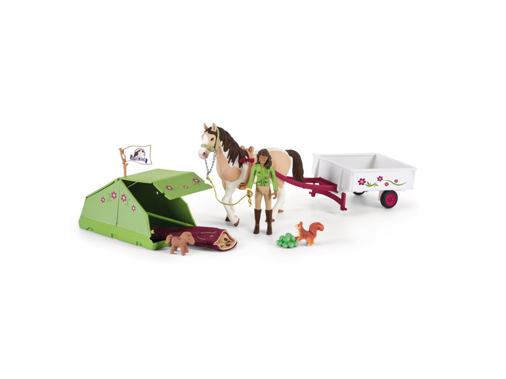 Sarah s koníkom a zvieratkami od Schleich® Horse Club kempujú. Sarah pomocou popruhu pripevní príves k svojej kobyle Pinto. Príves je plne naložený kempovacími potrebami. Nasadí si helmu, chytí ohlávku a spoločne vyrazia na cestu. Sarah postaví stan, vybalí svoj útulný spací vak a vloží do neho roztomilú hračku koníčka. Veverička ich zvedavo pozoruje. Pred spaním umiestni Sarah tajnú vlajku Horse Club. Sada obsahuje: 1x príves, 1x stan, 1x plyšový kôň, 1x vlajka HC, 1x spací vak pre Sarah, 1x bedrový pás, 1x kobyla Pinto, 1x Sarah (plne pohyblivá figúrka), 1x veverička, 1x helma, 1x zelené jablko, 1x ohlávka. Schleich® figúrky sú všetky modelované v najjemnejšom detaile, láskyplne maľované a povzbudzujú deti k tomu, aby sa hrali a zároveň sa učili. Rozmer balenia: 24,5 x 19 x 6,6 cm. Nevhodné pre deti do 3 rokov. Odporúčaný vek: 5-12.