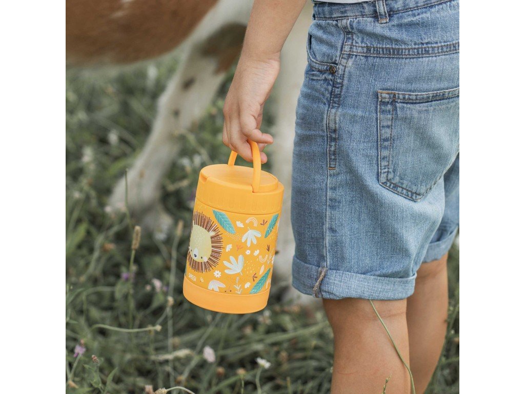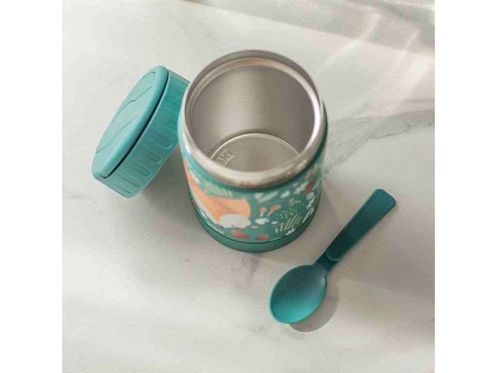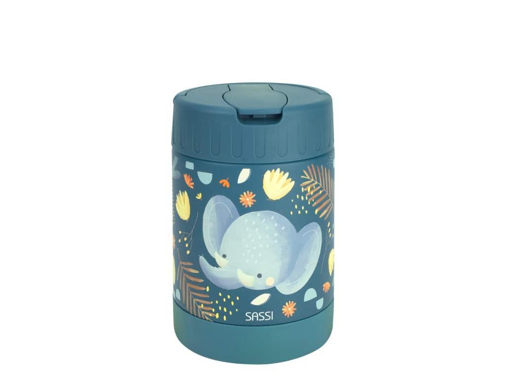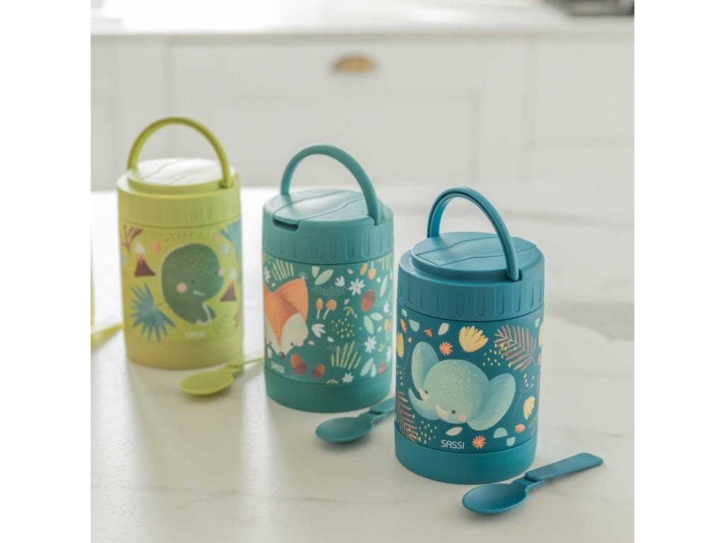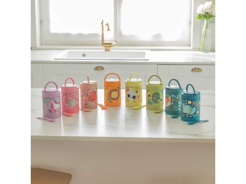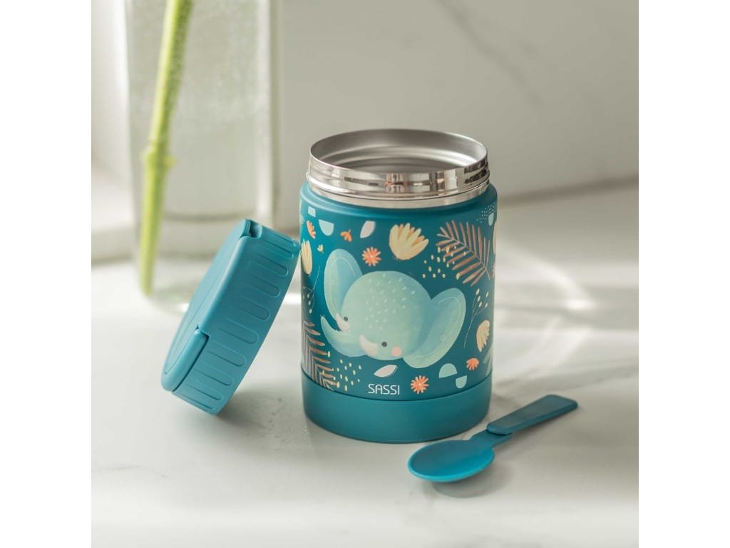 Termoska na jedlo s motívom múdreho sloníka Chewyho je ideálna na udržiavanie detských jedál teplých doma, v škôlke alebo na cestách. Vyrobená z kvalitnej nehrdzavejúcej ocele s dvojitou stenou, udrží jedlo teplé (alebo studené) celé hodiny a zabezpečí, že bude vždy chutné a pripravené na podávanie. Vzduchotesné viečko a kompaktný dizajn umožňujú bezpečné prenášanie v batohu či taške. Táto izolovaná termoska je ideálna na prvé príkrmy, polievky alebo pyré, ľahko sa čistí a je úplne bez BPA a PVC.
