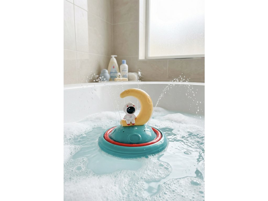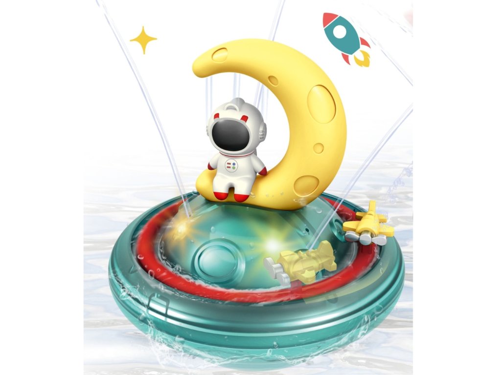 Striekacia hračka do vody Astronaut MesiacPlávajúca striekacia hračka pre detiStriekacia hračka do vody Astronaut Mesiac premení kúpanie na vesmírnu misiu plnú vody, svetiel a fantázie. Po položení na hladinu sa cez indukčný spínač automaticky aktivuje čerpadlo a voda začne striekať, pričom loďka môže jemne rotovať. Farebné LED svetlá vo vnútri základne rozžiaria vodu a vytvárajú efekt malého vesmírneho kolotoča, ktorý deti fascinuje pri kúpaní aj v bazéne.Hračka podporuje zmyslové vnímanie, predstavivosť a motivuje deti, aby si kúpanie spájali s príjemným zážitkom. Astronaut Mesiac funguje na batérie, ktoré nie sú súčasťou balenia. Hračka bezpečná a vhodná pre deti od 3 rokov. Ide o výborný darček pre malých fanúšikov vesmíru, ktorí milujú vodné hry a radi sledujú, ako prúdy vody striekajú do všetkých strán.Nevhodné pre deti do 3 rokov. Používať len pod priamym dohľadom dospelej osoby.