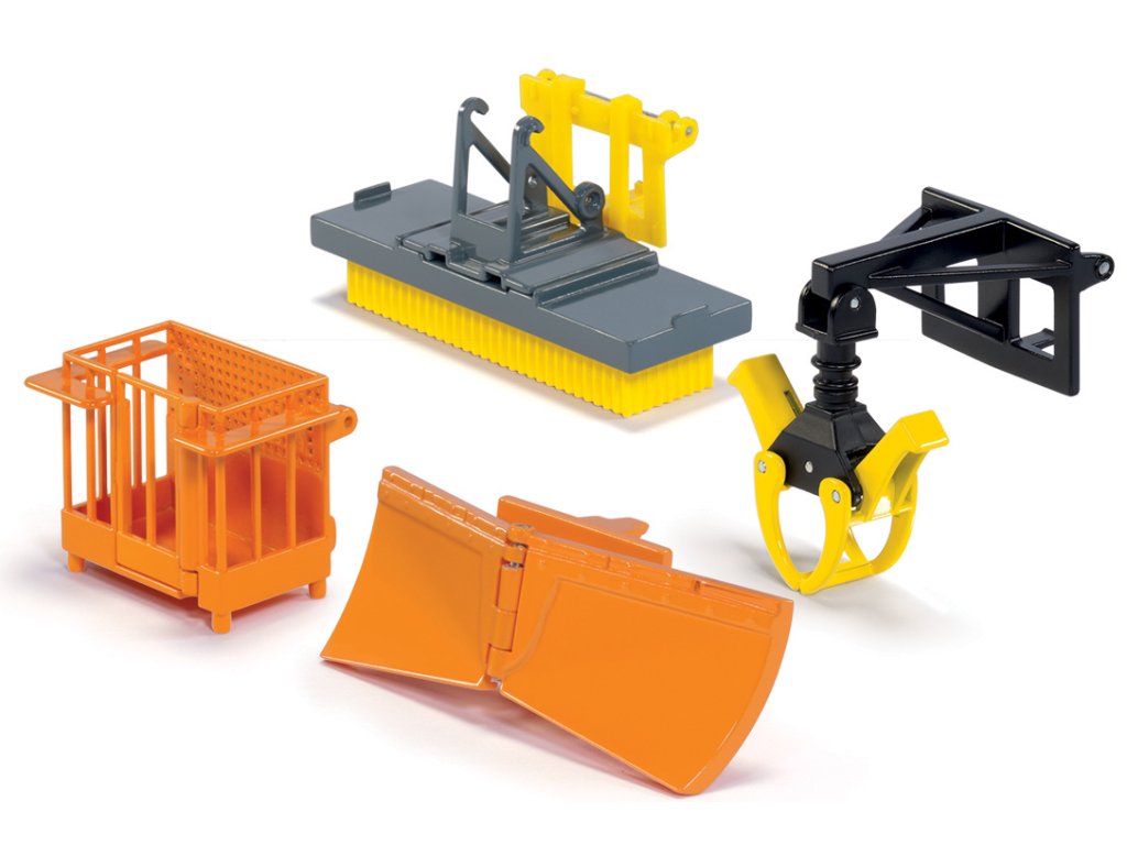 Rad upevňovacích zariadení pre traktory SIKUFARMER32 s poprednými nakladačom. Skladá sa s pracovné plošiny, snehového pluhu, zametacej kefy a naberačky kmeňov stromov. Pracovná plošina je tiež vybavená dverami. Snežný pluh sa môže pohybovať zľava doprava a všetky tri zberača kmeňov majú voľne pohybujúce sa ´´pazúry´´. Charakteristickým rysom zametacieho kefy je dodaná paletová vidlica. Tá môže byť použitá na vyzdvihnutie kefy. Hroty paletové vidlice Fendt 939 Vario s čelným nakladačom traktora z radu SIKUCONTROL32 tiež pasujú do držiaka zametacej kefy. Mierka: 1:32. Rozmer: 210 x 131 x 59 mm. Rozmer balenia: 21 x 13,1 x 5,9 cm. Vek: 3+