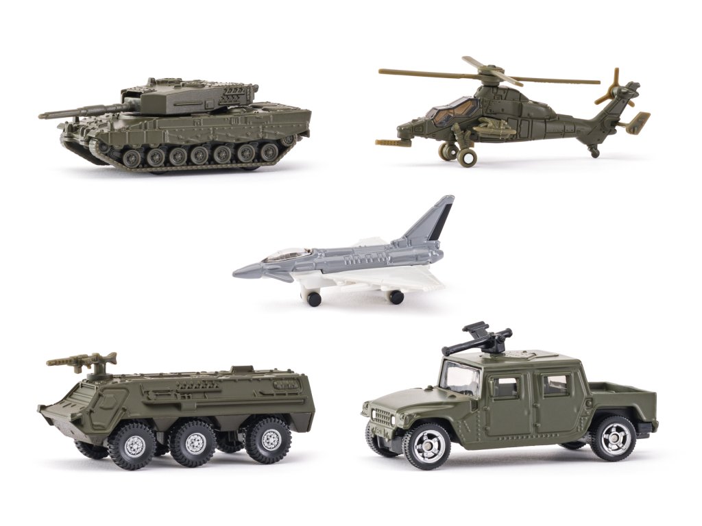 Sada vojenských vozidiel SIKU Military. Súprava obsahuje 5 rôznych modelov, ktoré sú vernou replikou vojenských vozidiel. Modely sa vyznačujú realistickými detailmi a sú vyrobené z tlakovo zliatinových kovových a plastových komponentov. Modely SIKU neobsahujú žiadne PVC a spĺňajú medzinárodné bezpečnostné normy pre hračky. Obsah: 8311 Pickup Desert Lion – rozmery modelu: 3 x 4 x 8 cm, 8312 Vojenský tank – rozmery modelu: 2,5 x 3 x 8,5 cm, 8313 Obrnené vozidlo – rozmery modelu: 3,5 x 3 x 7,5 cm, 8314 Bojový vrtuľník – rozmery modelu: 3 x 2,5 x 8 cm, 8315 Vojenská stíhačka – rozmery modelu: 2,7 x 4 x 7 cm. Väčšina modelov má pohyblivé prvky. Súprava je balená v krabičke. Rozmery balenia: 10,8 x 28,5 x 4,8 cm. Vek: 3+