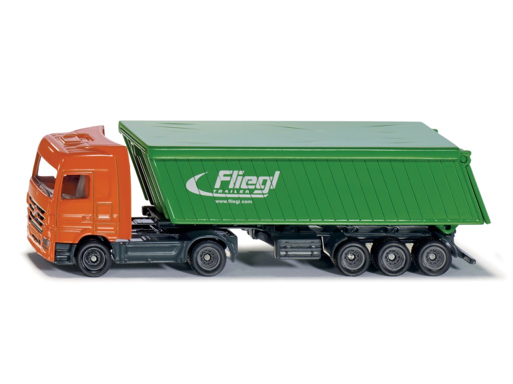Siku Super - Kamión s vlekom je detailne prepracovaná kópie v mierke 1:87. Podľa najnovších bezpečnostných predpisov, môžu byť sypké materiály prepravované kamiónom len ak sú zakryté plachtou. SIKU túto najnovšiu reguláciu prenáša aj a na svoje modely. Mercedes Actros tiahne 3-osi náves s pohyblivým sklápacích a odnímateľnou plachtou vyrobenú z pružného plastového materiálu slúžiace ako strecha. Zadné klapka na sklápač je pohyblivá. Otvára sa vždy a je jedno, či je plachta nasadená alebo nie je. Rozmer: 156 x 34 x 45 mm. Rozmer balenia: 21 x 5,4 x 7,5 cm. Vek: 3+