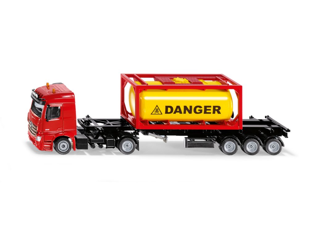 Tekuté suroviny a plyny sú spracovávané celosvetovo - sú preto prepravované v cisternových kontajneroch. Po mori, železnici, a dokonca po ceste. Práve na ceste je miesto, kde nový transportér Siku SUPER50 Mercedes-Benz Arocs so svojím trojnápravovým návesom, urobí veľa práce. Kontajner je namontovaný v ráme a môže byť vyložený a naložený, rovnako ako originál. Ventily je možné otvoriť a nádrž naplniť vodou. Rám návesu je možné predĺžiť a potom je možné transportovať dva kontajnery. Kabína vodiča sa môže nakloniť dopredu, a to odhalí výkonný vznetový motor. Vyrobené z kvalitného a odolného materiálu. Mierka: 1:50. Vek: 3+. Rozmer: 288 x 70 x 80 mm. Rozmer balenia: 34 x 11,5 x 6,5 cm.