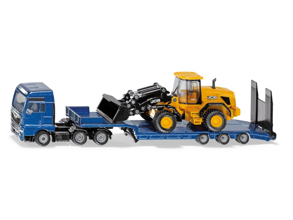 SIKU Super - nakladač MAN s kolesovým nakladačom JCB. Traktor s 3 nápravami s klamnou ľahkosťou ťahá kolesový nakladač JCB na spodnom 3-nápravovom dolnom nakladači na ďalšie stavenisko. Dokonca aj v teréne majú kolesá HGV s pneumatikami vyrobenými z pogumovaného materiálu dostatočnú priľnavosť. Čas na vyloženie: Prístupová rampa môže byť sklopená dolu a ťažký JCB pomaly zchádza dolu. Pre náročné použitie na stavenisku sú kabína vodiča zo série MAN TGX a nízky nakladač vyrobené z kovu. Nakladacie rameno a veľký lopatový bager nakladača sú pohyblivé a po vyložení sa okamžite presunú do pracovnej polohy. Mierka: 1:87. Rozmer: 198 x 38 x 53 mm. Rozmer balenia: 26 x 7,5 x 4,8 cm. Vek: 3+