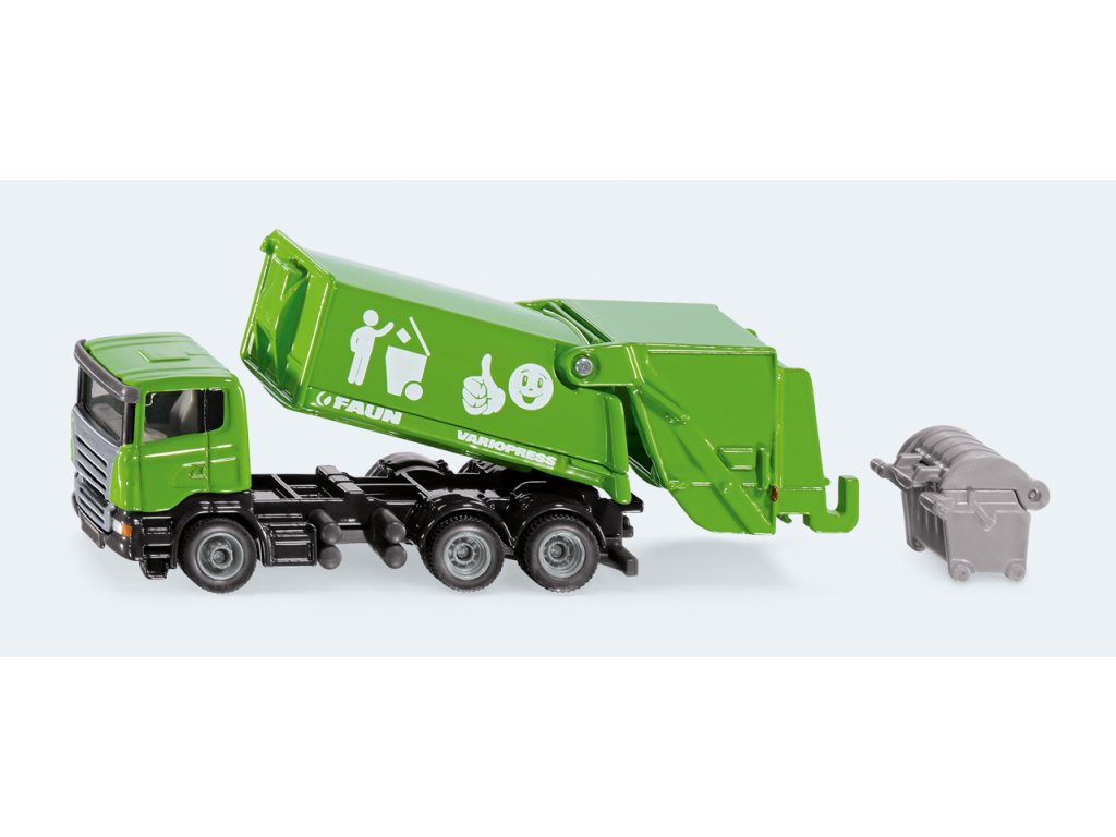 Smetiarske auto Scania-R s nadstavbou FAUN Variopress v mierke 1:87 je vyrobené prevažne z kovu vrátane korby a zadného čela. Korbu možno zdvihnúť a čelo otvoriť pre vyprázdnenie ´´odpadkov´´. Súčasťou je aj jeden kontajner z plastu s otváracím vekom. Rozmer: 136 x 30 x 40 mm. Rozmer balenia: 17 x 5,4 x 7,5 cm. Vek: 3+