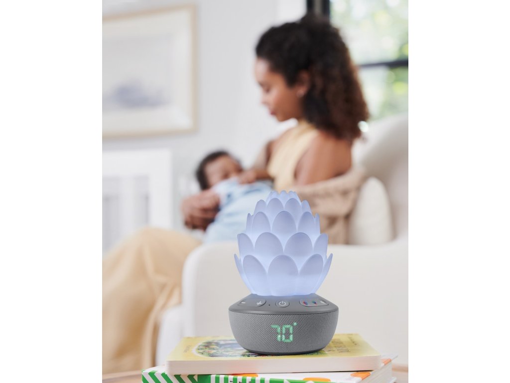 Inteligentný senzor plaču v tvare kvetiny upokojí dieťatko sladkými melódiami, zvukmi prírody a nahratým hlasom – dokonca aj uprostred noci! Senzor automaticky reaguje na plač dieťatka, aby sa upokojilo, čím sa bábätko a aj rodičia v noci lepšie vyspia. Nočné svetlo so siedmimi rôznymi farbami plus režimom svetelnej šou pre upokojujúcu animovanú žiaru upokojí každé dieťatko. Senzor disponuje aj teplomerom, aby ste vždy vedeli, či je v detskej izbe príjemná teplota.