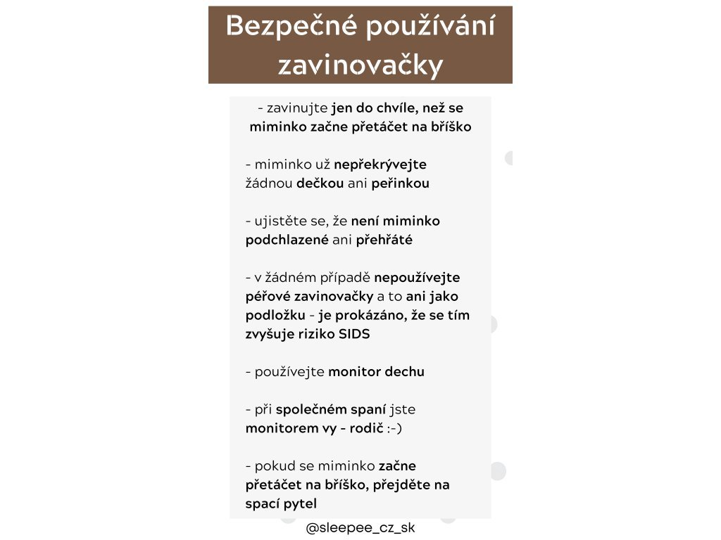 Ve chvíli, kdy se začne Vaše dítko přetáčet na bříško, je na čase otevřít rukávy zavinovačky a vyndat miminku ručičky ven nebo zavinovačku vyměnit za spací pytel.