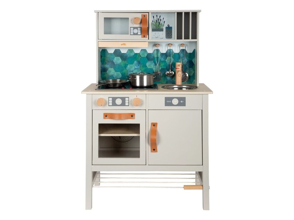 Kuchynka Tasty je vyrobená z kvalitného FSC® certifikovaného dreva. Moderný dizajn v šedom odtieni so štýlovými koženými madlami dokonale ladí s každým interiérom. Povrchy v chladničke a rúre sú potlačené kuchynskými detailmi, ktoré podporujú predstavivosť a zábavu.Rozvoj detských zručností