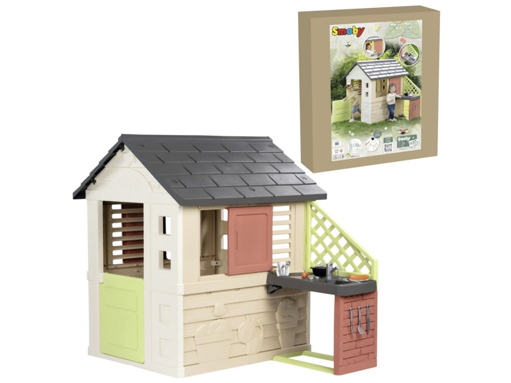 Stabilný, priestranný domček Smoby Life Nature so skvelou letnou kuchynkou ponúka množstvo zábavy pre najmenších. Kuchynka je pripevnená ku vonkajšej stene, má drez s kohútikom (nefunkčný), grilovaciu dosku na varenie a grilovanie a policu na riad. Zážitok z varenia dopĺňajú 2 poháre, 2 taniere, rôzne kuchynské náčinie, klobásy a malá rajnica. Jednoduchá montáž. Módne farebné prevedenie v tyrkysovej a zelenej dodáva záhradnému domčeku svieži a moderný vzhľad. Štyri robustné bočné steny sú navrhnuté veľmi detailne, motýle a malá mačka zdobia fasádu a vytvárajú zábavný dizajn. Vybavenie domu dopĺňajú 2 okná s lamelami, 2 posuvné okná s možnosťou otvárania a zatvárania a malé vstupné dvere. Domček je vyrobený z vysoko kvalitného plastu odolného voči UV žiareniu a je obzvlášť odolný voči poveternostným vplyvom a vyblednutiu. Tento výrobok obsahuje minimálne 57 % recyklovaného materiálu. Rozmery produktu (DxŠxV): 145 x 110 x 127 cm.