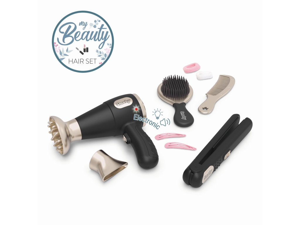 Kadernícka súprava My Beauty s fénom a príslušenstvom. Všetko príslušenstvo je realisticky navrhnuté, fén po stlačení tlačidla vydá zvuk a rozsvieti sa lampa, rovnako ako v skutočnosti! Súprava obsahuje elektronický fén s funkciou svetla a zvuku, 2 nástavce na fén, žehličku na vlasy, kefu, hrebeň, 2 sponky do vlasov a 2 gumičky do vlasov. Detská elektronická funkcia bez zahrievania. Rozmery fénu: 14 × 2,5 cm.