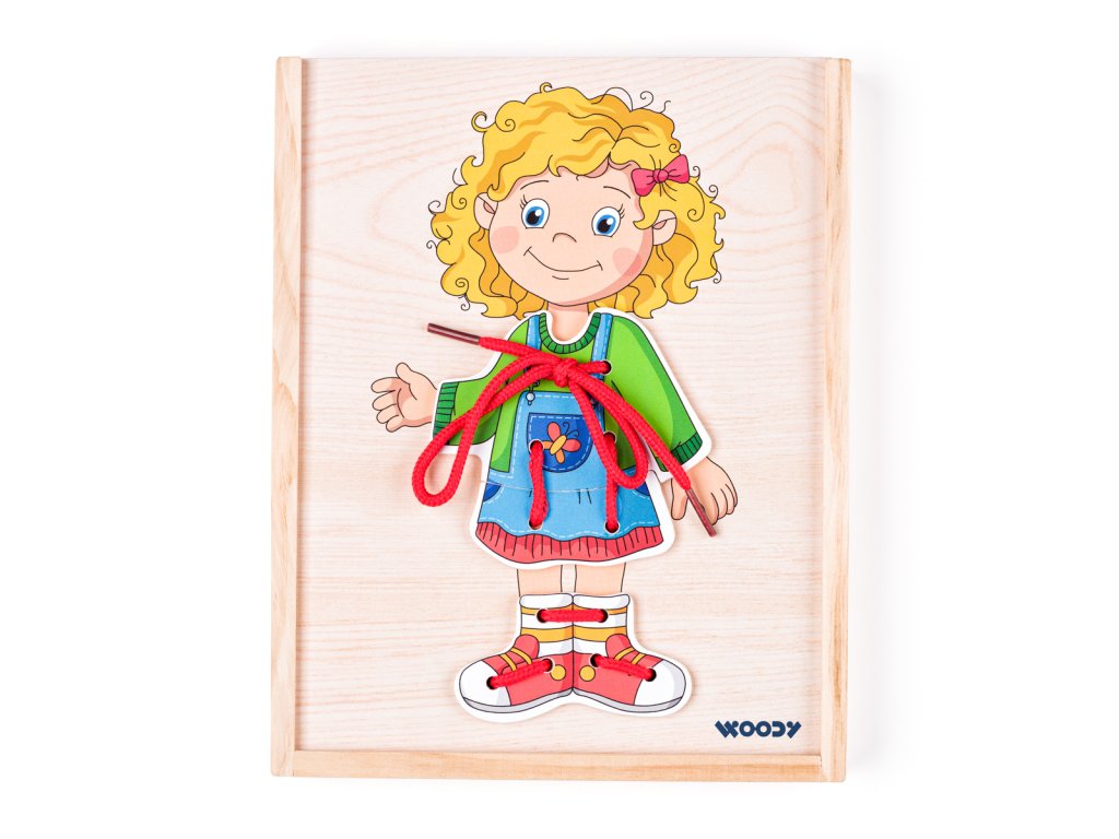 Deti majú možnosť si podľa vlastnej fantázie obliekať postavičku dievčatka. K dispozícii majú niekoľko variantov oblečenia. Dievčatko namaľované na vysúvacom veku škatuľky má na tele otvory, ktoré umožňujú prichytenie oblečenia šnúrkami. Súčasťou balenia sú 4 farebné šnúrky. Táto hračka rozvíja jemnú motoriku, logiku a fantáziu. | Vek: 3+ | Rozmer krabičky: 18,5 x 23 x 2,5 cm