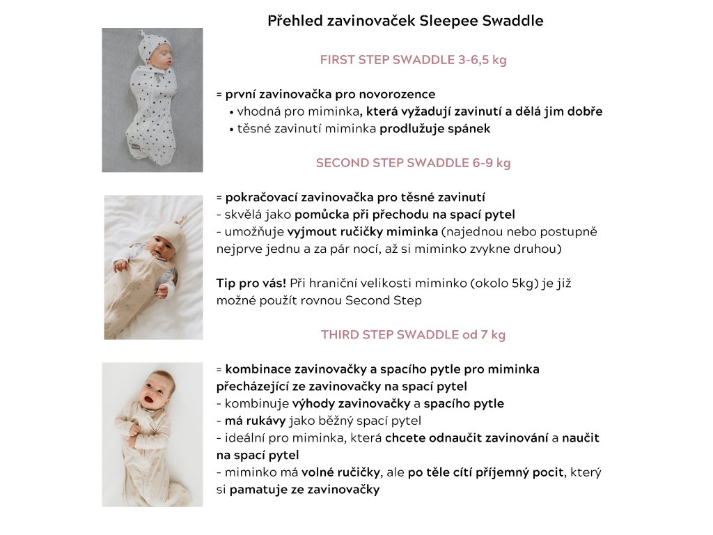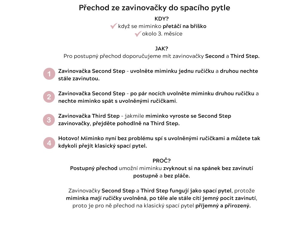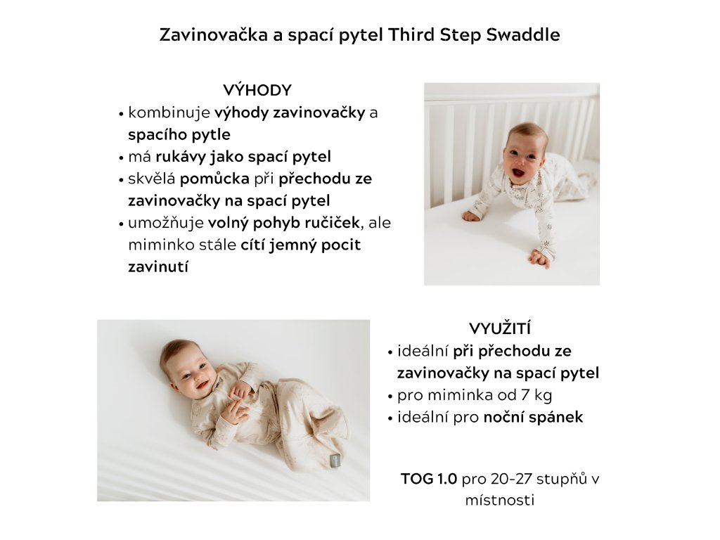 Third Step Swaddle doporučujeme pro miminka od přibližně 6 měsíců (podle velikosti miminka možno i dříve) nebo 7 kg váhy miminka.