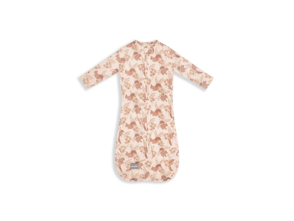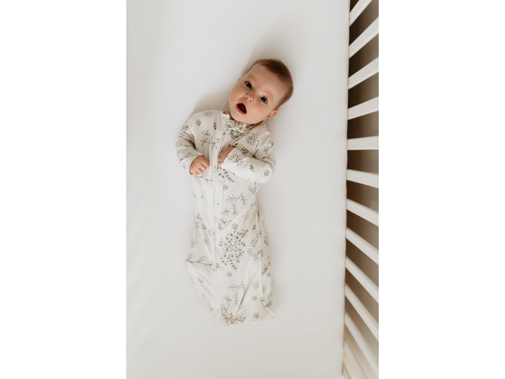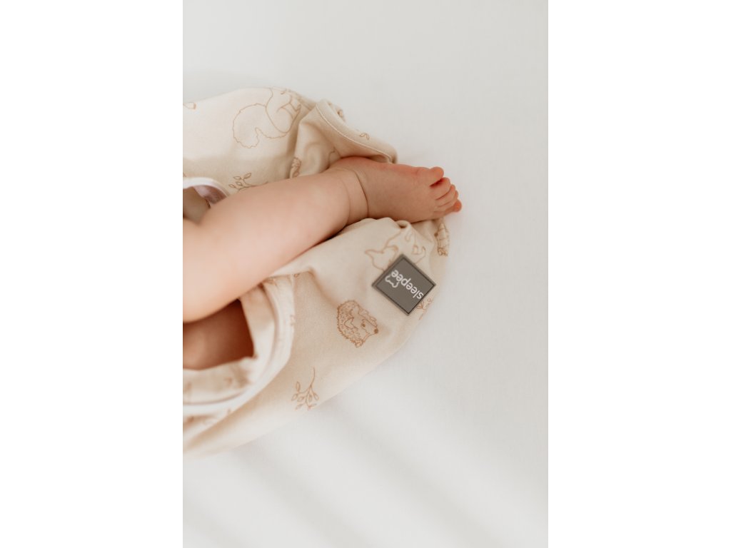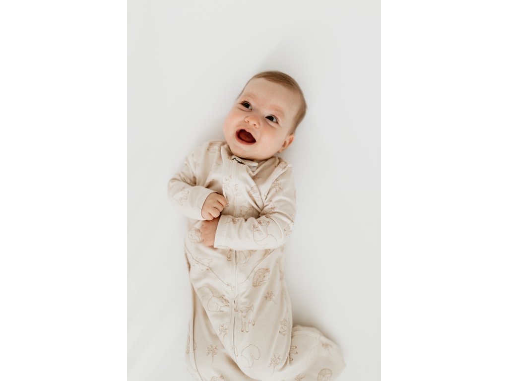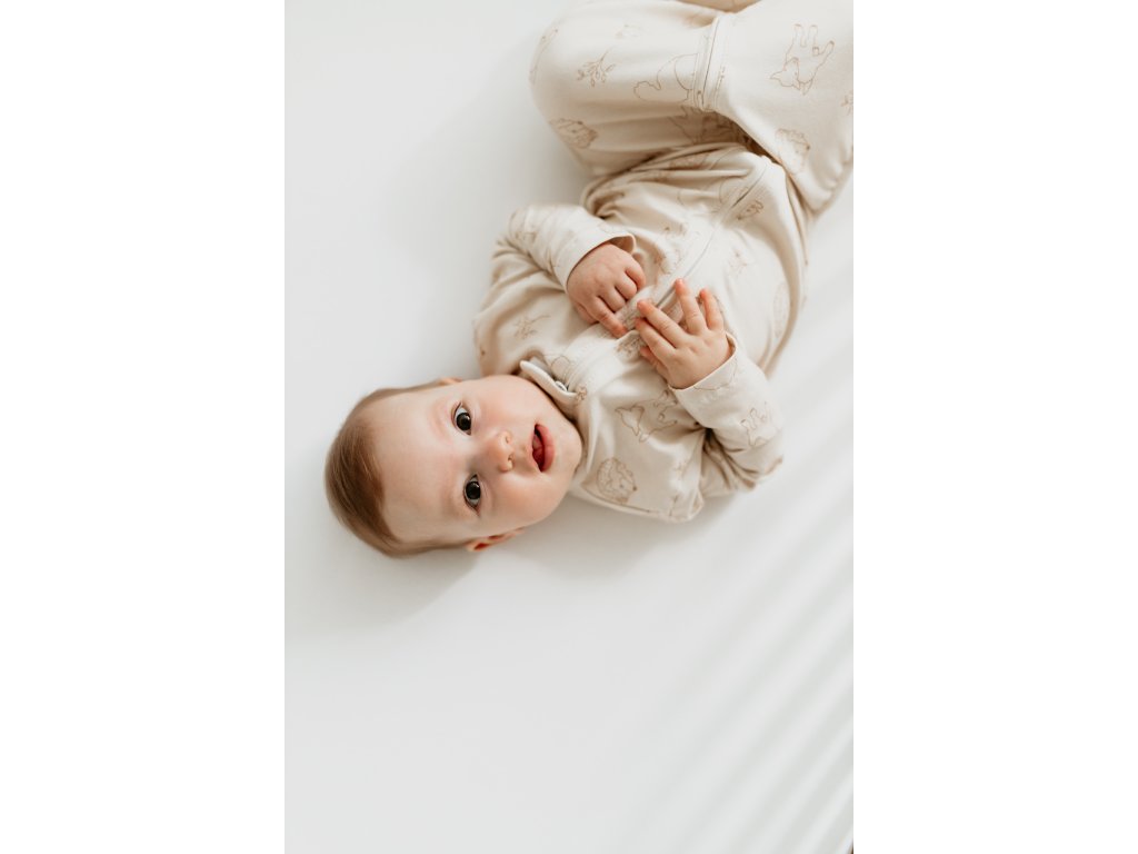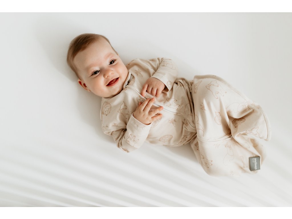 Spací pytel je na zip, takže se do něho miminko snadno obléká a v noci se v něm jednoduše přebaluje.