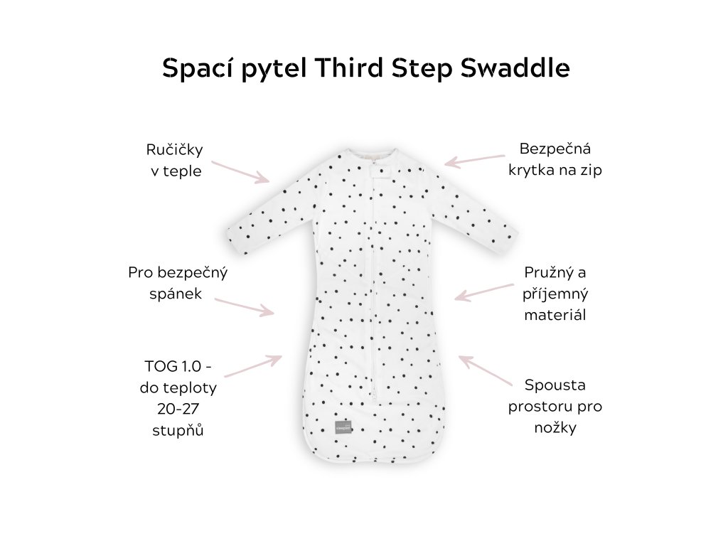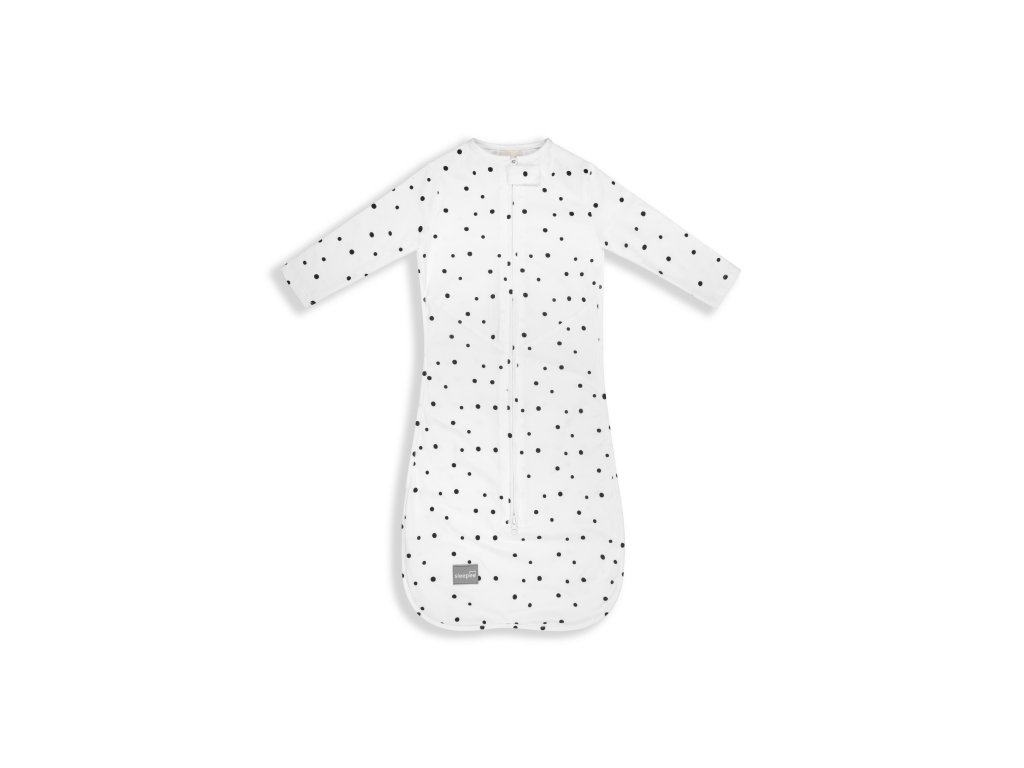 Spací pytel Sleepee Third Step Swaddle Black Dots kombinuje výhody tradiční zavinovačky s funkčností a bezpečností spacího pytle. Vypadá jako klasická zavinovačka, ale díky své velikosti a speciálnímu střihu funguje jako spací pytel.