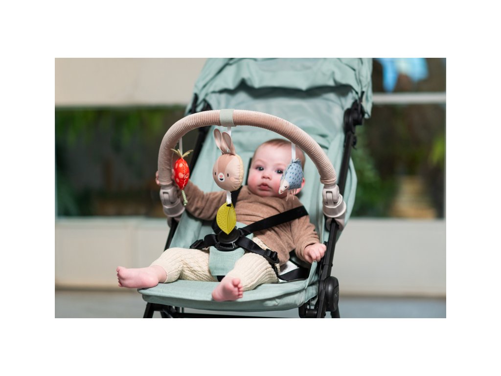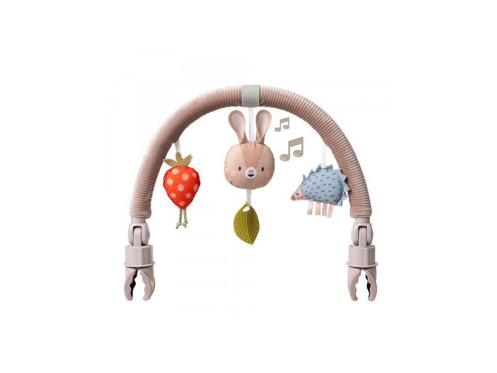 Hudobná hrazda určená na pripevnenie na kočík alebo autosedačku zabaví vaše bábätko na cestách. Ľahko ju s pomocou flexibilných plastových klipsov pripevníte k väčšine kočíkov aj autosedačiek. Pozornosť dieťaťa upúta králiček, ktorý po ľahkom dotyku hrá melódiu, hrkajúci ježko aj cinkajúca jahôdka.