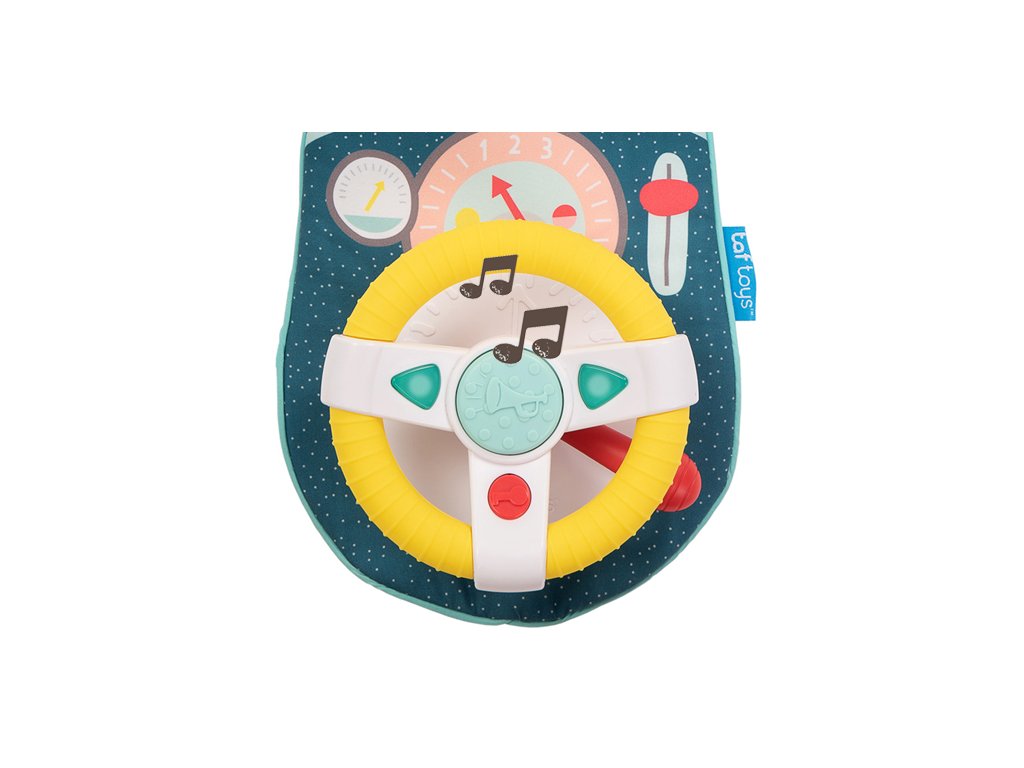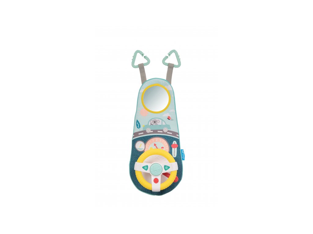 Hrací pultík s volantom ľahko zavesíte za opierku hlavy pred dieťa sediace v autosedačke v smere jazdy.