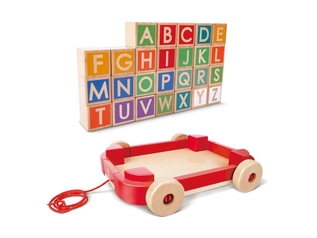 Učte sa pri hraní s týmto úžasným ťahacím vozíkom naplneným stohovacími kockami. Celkom 26 kociek obsahuje písmená, takže sa malé deti môžu učiť abecedu pri skladaní. Kocky sú obojstranné a obsahujú veľké aj malé písmená. Vozík je vybavený pogumovanými kolesami proti poškriabaniu. Rozmer: 21x5,6x21 cm. Rozmer balenia: 25x24x6,5 cm. Vek 2+