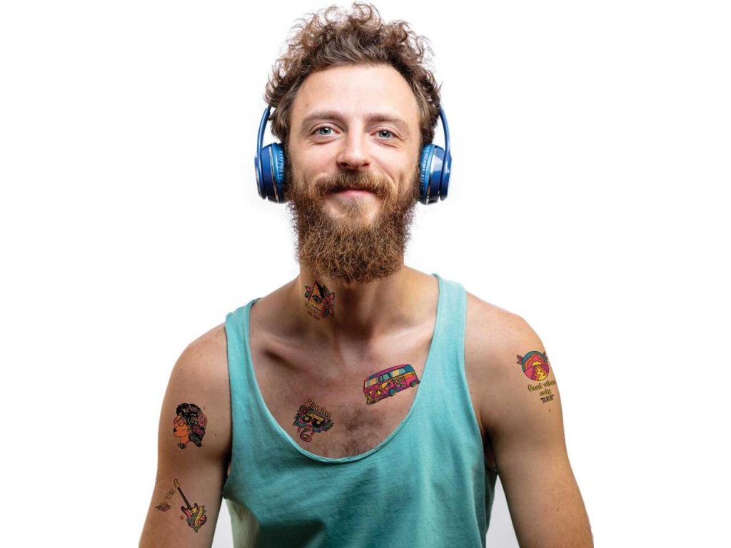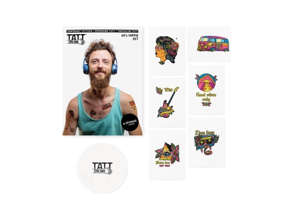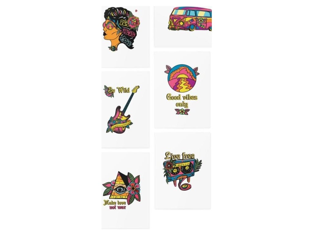 Láska, pokoj a trocha nostalgie, to je to, čo tvorí tento tetovací set. Dizajn v štýle 60. rokov bude vyhovovať vášmu vzhľadu hudobného festivalu, tematickej kancelárskej párty alebo len tak v horúcom letnom dni.