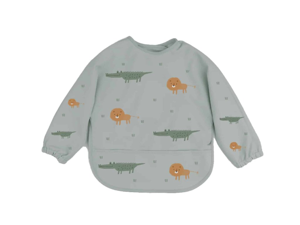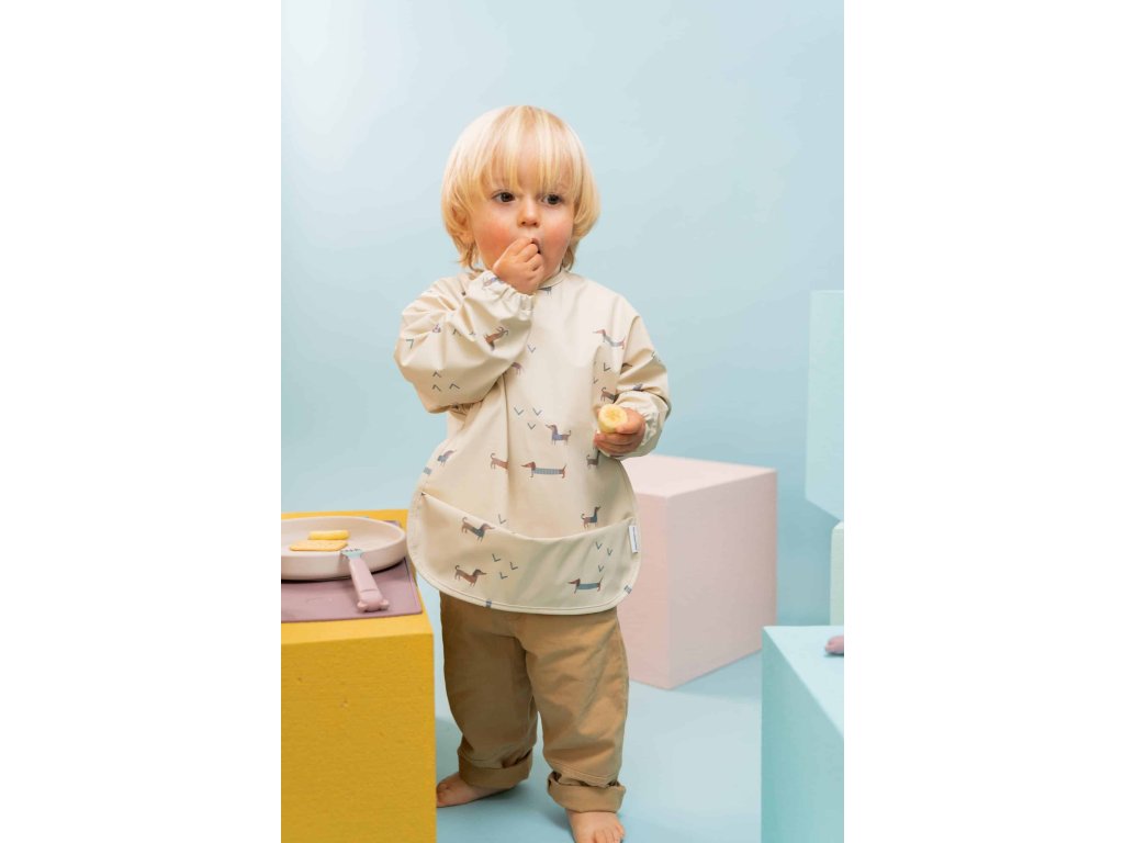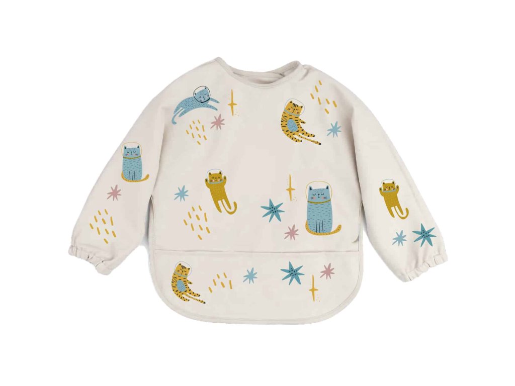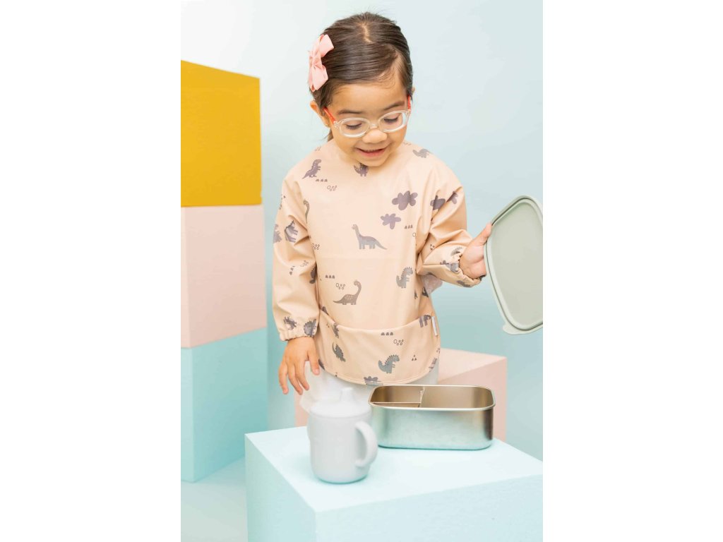 Podbradník je vyrobený z nepremokavej tkaniny, ktorá sa ľahko čistí, odoláva väčšine škvŕn a pachov. 100% recyklovaný Oeko-Tex polyester je nielen vodeodolný, ale je tiež možné ho umývať v práčke. Vodoodpudivý materiál robí tento všestranný podbradník nielen ideálnym na jedenie a kŕmenie, ale je tiež skvelý pre umelecké a remeselné projekty doma alebo v škôlke. Vstavané vrecko na zachytávanie pomáha udržať neporiadok pri jedle na minimum.