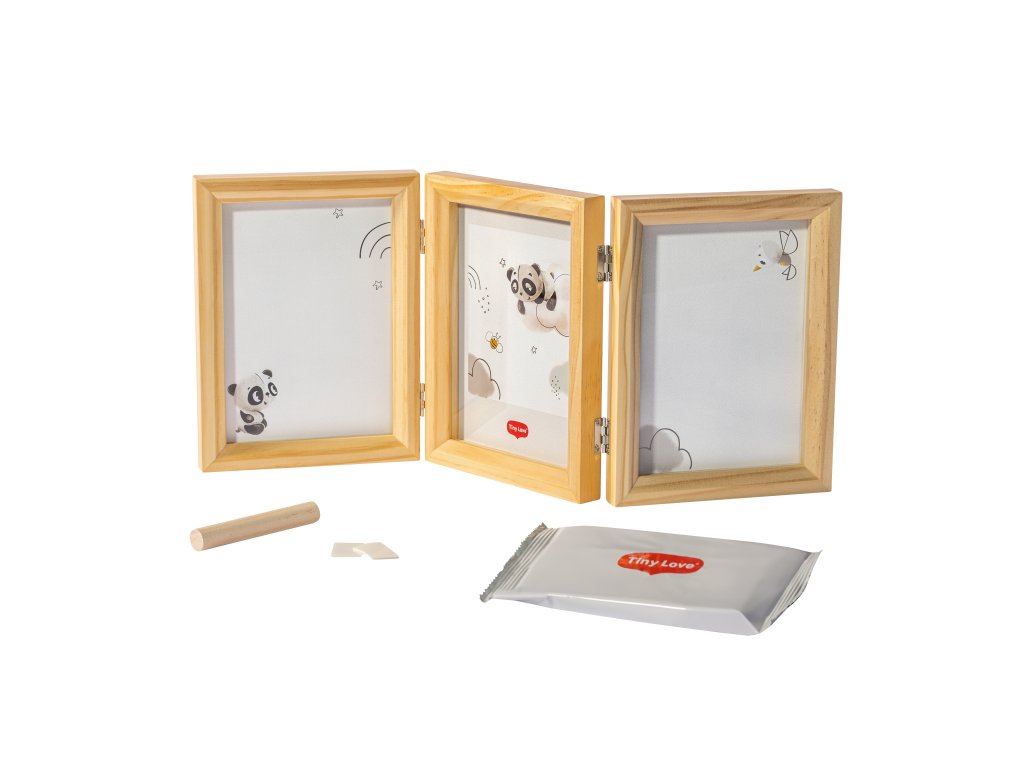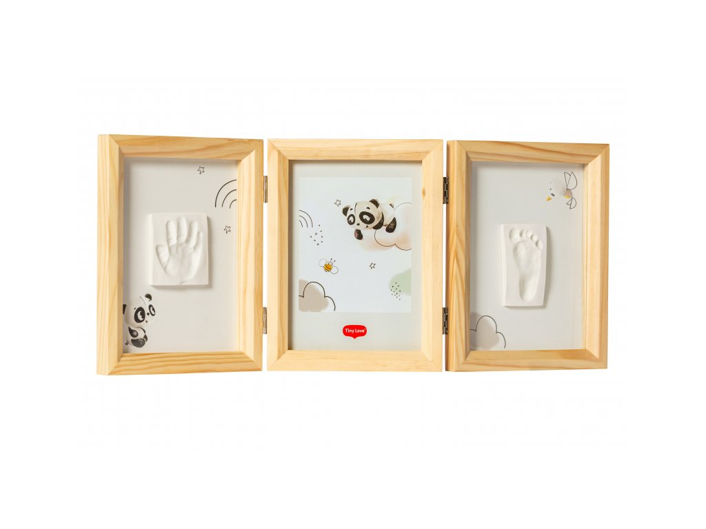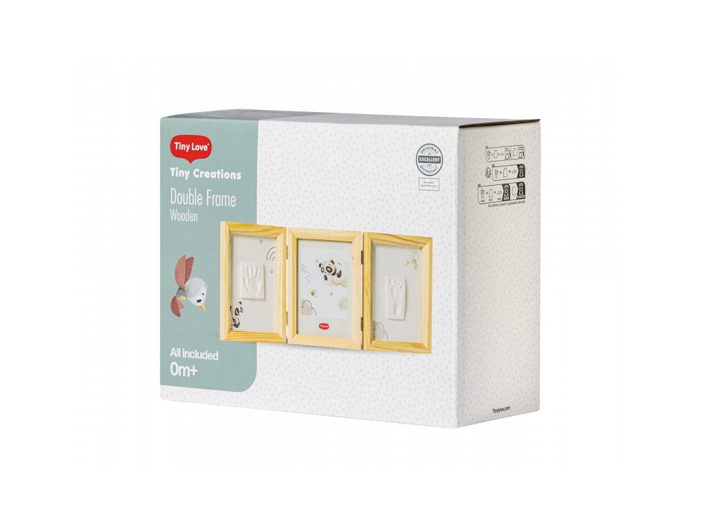 Drevený rámček Tiny Creations Double Frame ponúka tri oddelené priestory pre fotografiu a odtlačok ručičky a nožičky Vášho bábätka.Vyrobte si krásnu dekoráciu, ktorá vám zároveň pomôže uchovať spomienky na krásne obdobie po narodení vášho dieťaťa.