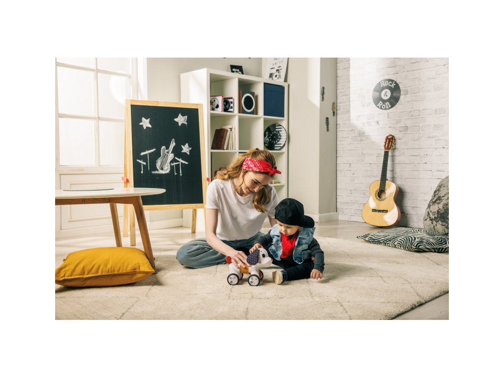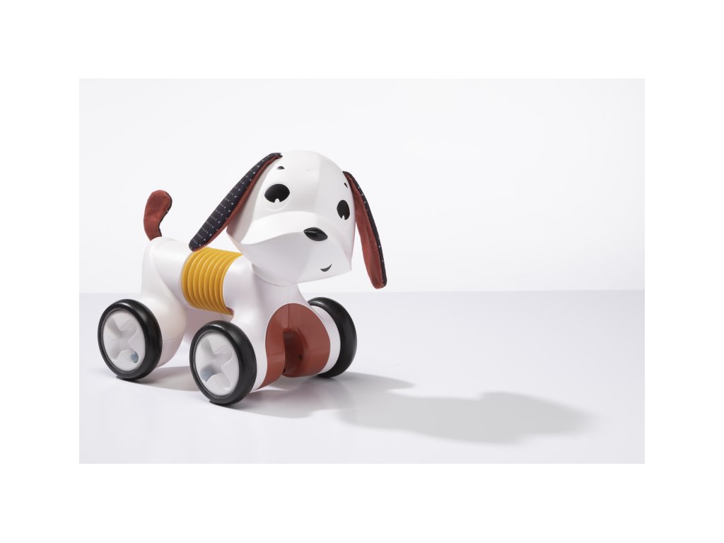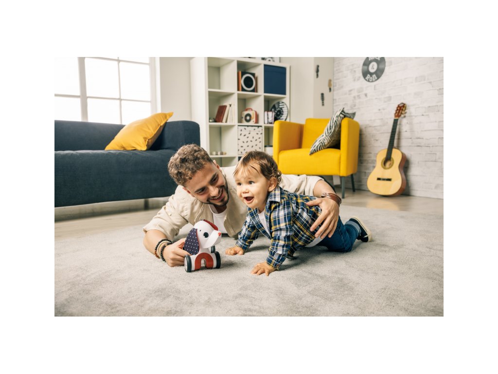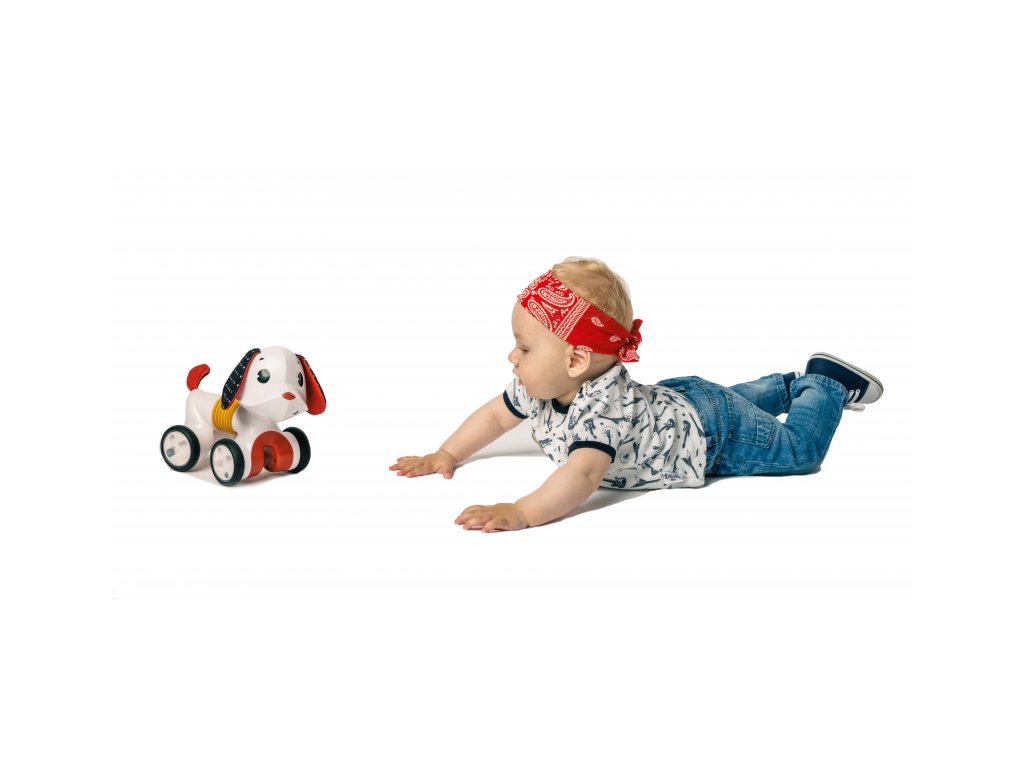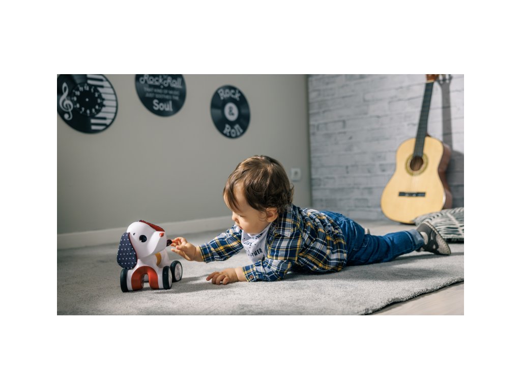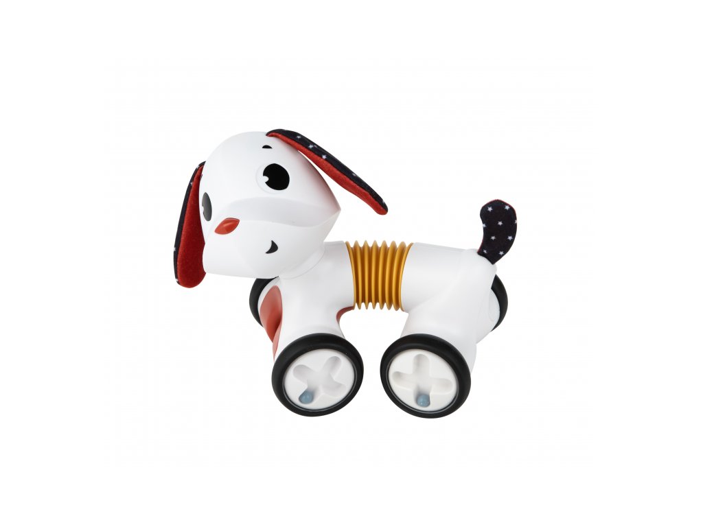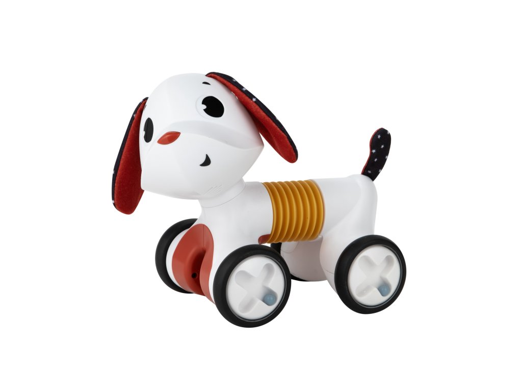 Rozkošná hudobná hračka v podobe psíka s naťahovacím harmonikovým telom a kolieskami zabaví dieťa od hrania na brušku cez lezenie a samostatné sedenie až po prvé krôčiky. Stlačením hlavy sa psík rozbehne, vie aj štekať a hrať 5 melódií.Vďaka ohybnému telu vie sedieť aj pri jazde zatáčať. Jeho hlavou s šuštiacimi ušami je možné otáčať.